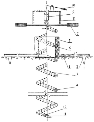 На местности выбирается площадка, устанавливается устройство, и на его основании 1 размещается оператор. Под его тяжестью электроды 2 погружаются в землю. Оператор устанавливает заземлитель 3 в направляющий патрубок 5 и с помощью рукояток 7 вращает заземлитель 3 по ходу внутренней резьбы 6 патрубка 5 до соприкосновения с землей. Затем оператор заполняет емкость 8 электропроводящим составом (жидкостью) и с помощью поршневого насоса 9 с ручным приводом 10 прокачивает жидкость по продольному внутреннему каналу 4 заземлителя 3 до установленного на нем распылителя 11 с отверстиями 12 расположенными в кольцевой выемке распылителя 11. После появления распыленной жидкости в отверстиях 12 оператор продолжает вращение заземлителя 3 который погружается в землю. Через определенные отрезки глубины погружения (в зависимости от физических свойств и состояния земли) оператор подкачивает жидкость к распылителю 11, при этом распыленная жидкость легко проникает в поры земли, увлажняет ее, облегчает процесс погружения заземлителя 3, снижая коэффициент его трения и механическое сопротивление земли. Одновременно, если жидкость имеет электропроводящий состав, снижается электрическое сопротивление заземляющего устройства.