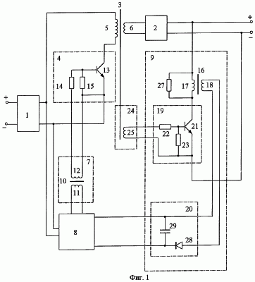 Управляющий вход силового электронного ключа 4 подключен через согласующую цепь 7 к выходу схемы 8 управления, связанной цепью питания с выходными выводами входного фильтра 1. Вход обратной связи схемы 8 управления подключен к выходу цепи 9 обратной связи, вход которой подключен к выходным выводам выходного фильтра-выпрямителя 2.