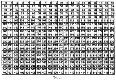 Показанная в качестве примера матрица изображения является изображением с шириной в 20 пикселей и высотой в 21 пиксель. Позиция пикселя задана целым числом. Матрица кадра пронумерована, как показано на фиг.1, от 0 до 419. Число внутри каждой клетки соответствует положению соответствующего пикселя.