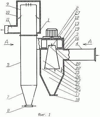 Вентилятор (2), жестко закрепленный на крышке пылеосадителя (3), имеет рабочее колесо с лопатками (12), улитку (13) и выходной патрубок (14) (фиг.2), который жестко соединен с входным тангенциальным патрубком (6) цилиндрического корпуса (5) фильтра тонкой очистки (1) для короткого пути прохода скопившихся твердых примесей на контуре наружной границы воздушного потока под действием центробежных сил в улитке (13) вентилятора (2) и для омывания этим контуром воздушного потока внутренней стенки цилиндрического корпуса (5) фильтра тонкой очистки (1).