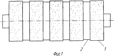 После окончания шлифовки поверхность бочки и проточек составляет по Ra=0,8-1,3 мкм. Для получения микрошероховатости на поверхности бочки, равной Ra=5,5-7,0 мкм, валок подвергают дробеструйной обработке. Для этого перед обработкой на поверхность бочки накладывают трафарет с прорезями вдоль бочки с шириной, равной ширине участков с необходимой максимальной высотой микронеровностей. После дробеструйной обработки, поверхности, закрытые трафаретом (проточки), останутся шлифованными с шероховатостью 0,8-1,3 мкм Ra, а на незащищенных участках получают высокую шероховатость в пределах 5,5-7,0 мкм Ra. Если взять предельные величины шероховатостей проточек и бочки валка получим отношение шероховатостей проточек, равного 0,1-0,3 от шероховатости поверхности бочки, обеспечивающую дополнительный эффект устойчивости полосы при прокатке.