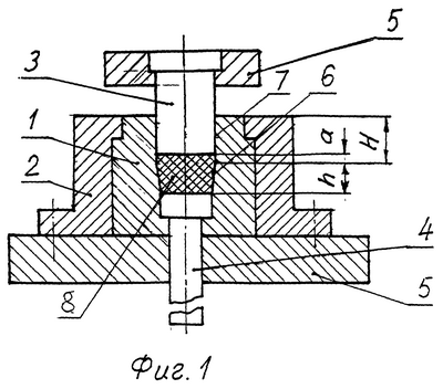 Пресс-форма содержит матрицу 1, запрессованную в бандаж 2, пуансон 3, выталкиватель 4 и опорные плиты 5. Рабочая зона матрицы 1 (первый вариант исполнения) включает конический и цилиндрический участки 6, 7, соответственно. Высота конического участка 6 выбирается равной высоте h брикета 8 за вычетом высоты а цилиндрического пояска. Конусность конического участка 6 составляет 0,15-0,20, что позволяет уменьшить усилие выталкивания отпрессованного брикета из матрицы. Высота цилиндрического участка 7 Н=135 мм, которая определена по формуле: