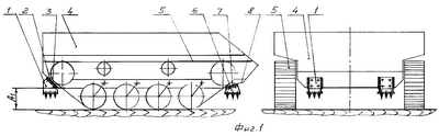 Гусеничная машина состоит из броневого корпуса 4 с наклонными нижними – передним 8 и задним 3 – листами, ходовой части 5 с механизмом изменения клиренса машины и устройства для крепления на деревянном настиле платформы.