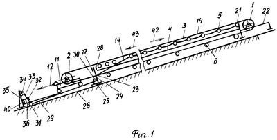 При обрыве ленты 3 она под действием синусоидальной составляющей собственного веса и веса находящегося на ней груза 41 начнет скатываться вниз в направлении 43. При резком уменьшении натяжения ленты 3 после ее обрыва она начнет провисать в пролетах между роликоопорами 5. Одновременно при обрыве ленты 3 тележка 11 за счет натяжения каната 12 (под действием веса противовеса) начнет смещаться по направляющей раме 36 в направлении 43 до упора (по первому варианту) в рычаг 33 (фиг.1) При повороте рычага 33 против часовой стрелки гибкие элементы 29 смещаются справа-налево, благодаря чему поворотная стойка 24 поворачивается по часовой стрелке относительно шарнира 25, натягивая прикрепленные (23) к ней канаты 13 и 14. При этом угол поворота рычага 33, а следовательно и угол поворота поворотной стойки 24, а также смещения канатов 13, 14 могут регулироваться за счет сменных закладных элементов 40. Благодаря натяжению канатов 13 и 14 уменьшается их провес между роликоопорами 5 и они поднимаются до соприкосновения с лентой 3. При смещении канатов 13, 14 в направлении 43 рычаги 17 поворачиваются против часовой стрелки, дополнительно поднимая канаты 13 и 14, которые входят во взаимодействия с лентой 3 практически по всей длине конвейера. При этом грузонесущая ветвь ленты 3 поднимается над желобчатыми роликоопорами 5 и начинает скользить по канатам 13 и 14 при коэффициенте трения скольжения. За счет превышения силы трения ленты 3 с грузом 41 над синусоидальной составляющей их весов грузонесущая ветвь ленты 3 быстро затормаживается при минимальном ее обратном ходе после обрыва.