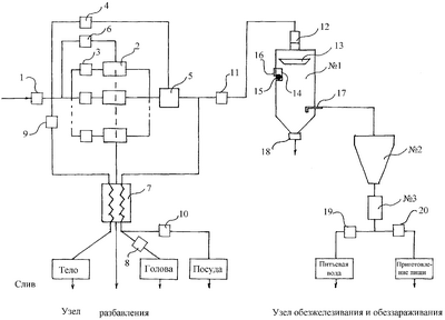 Первый узел состоит из входного запорного вентиля 1, связанного с трубопроводом водонапорной башни (на схеме не показана), необходимого количества электрических дистилляторов 2 с запорными вентилем 3 и вентилем-регулятором 4, имеющим возможность фиксировать заданное соотношение при разбавлении, центробежным смесителем 5; запорного вентиля охлаждающей воды 6, теплообменника 7 с запорными вентилями 8, 9, 10.
