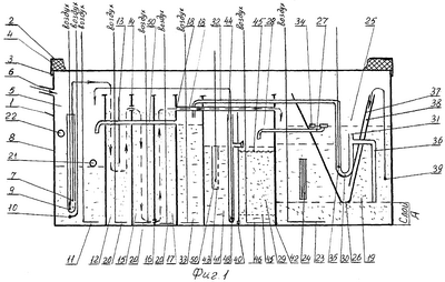 Устройство состоит из корпуса 1 с паронепроницаемой крышкой 2, в котором размещены все емкости для очистки воды. Крышка 2 выполнена с отбортовкой 3 по всему периметру, так что при закрытии корпуса 1 отбортовка 3 охватывает стенки корпуса 1 и тем самым препятствует попаданию во внутрь корпуса 1 атмосферной влаги. Крышка 2 шарнирно закреплена (на чертеже не показано) на корпусе 1 и снабжена утеплителем 4 по всей внутренней поверхности. Уравнивающий резервуар 5 снабжен подводом 6 сточных вод, насосом 7, установленным в трубчатом фильтре 8 грубых нечистот и предназначенным для перекачки сырой воды в камеры с циклической интенсивной аэрацией. Трубчатый фильтр 8 грубых нечистот выполнен перфорированным в его нижней части, а внутри него ниже насоса установлен аэратор 9, обеспечивающий разгон крупных фракций от перфорированных отверстий. В уравнивающем резервуаре 5 установлены под трубчатым фильтром 8 крупнопузырчатый аэратор 10, придонный аэратор 11. В устройстве установлено три камеры циклической интенсивной аэрации. Первая 12 камера выполнена с перегородкой 13, разделяющей ее на два отсека, причем сообщение отсеков происходит в нижней части камеры, в связи с чем очищаемая вода на более протяженном пути подвергается воздействию аэрации. Из первой 12 камеры вода перетекает через патрубок 14 в верхней части во вторую 15 камеру, а в из ее придонной части через патрубок 16 перетекает в третью 17 камеру, в верхней части которой установлен переливной патрубок 18, через который вода поступает в аэрационный резервуар 19. Во всех трех камерах 12, 15, 17 установлены аэраторы 20 и воздух подается в камеры 12 и 17 в первой фазе, а в камеру 15 – во второй фазе. Уравнивающий резервуар 5 снабжен рабочим датчиком 21, датчиком 22 максимального уровня сточных вод. Активационный резервуар 19 снабжен распределительным аэратором 23, биологической загрузкой 24. В активационном резервуаре 19 установлен отстойник 25, выполнен в виде усеченной перевернутой пирамиды с открытым нижним соплом 26. Внутри отстойника 25 в верхней части установлен переливной трубопровод 27, выходное сопло которого заканчивается в аэрационной камере 28, заполненной пористым фильтром 29, эрлифт-рециркулятор 30, выполненный в виде U-образной формы, одно колено 31 которого расположено чуть ниже зеркала воды отстойника 25, а другое 32 связано с камерой 33 стабилизации ила, и крупнопузырчатый аэратор 34, расположенный на поверхности воды отстойника 25 и предназначенный для разбивания биологической пленки на поверхности воды отстойника 25. Эрлифт-рециркулятор 30 снабжен внутренним насосом 35, а колено 31 снабжено патрубком 36, свободный конец которого расположен в зоне слоя А ила активационного резервуара. Отстойник 25 выполнен с перегородкой 37, которая образует канал 38 с открытым дном и верхней частью. В аэрационном резервуаре 19 дополнительно установлен насос 39 для перекачки воды из аэрационного резервуара 19 в канал 38 отстойника 25. Аэрационная камера 28 выполнена из двух сообщающихся посредством патрубка 40, расположенного в придонной части, отсеков 41 и 42. Отсек 41 снабжен двумя цилиндрическими емкостями 43, 44. Отсек 42 заполнен пористым фильтром 29, который сверху и снизу закрыт сеткой 45, и снабжена расположенным в ее придонной части распределительным аэратором 46. Емкость 44 выполнена сплошной и снабжена патрубком 47, выходной кон