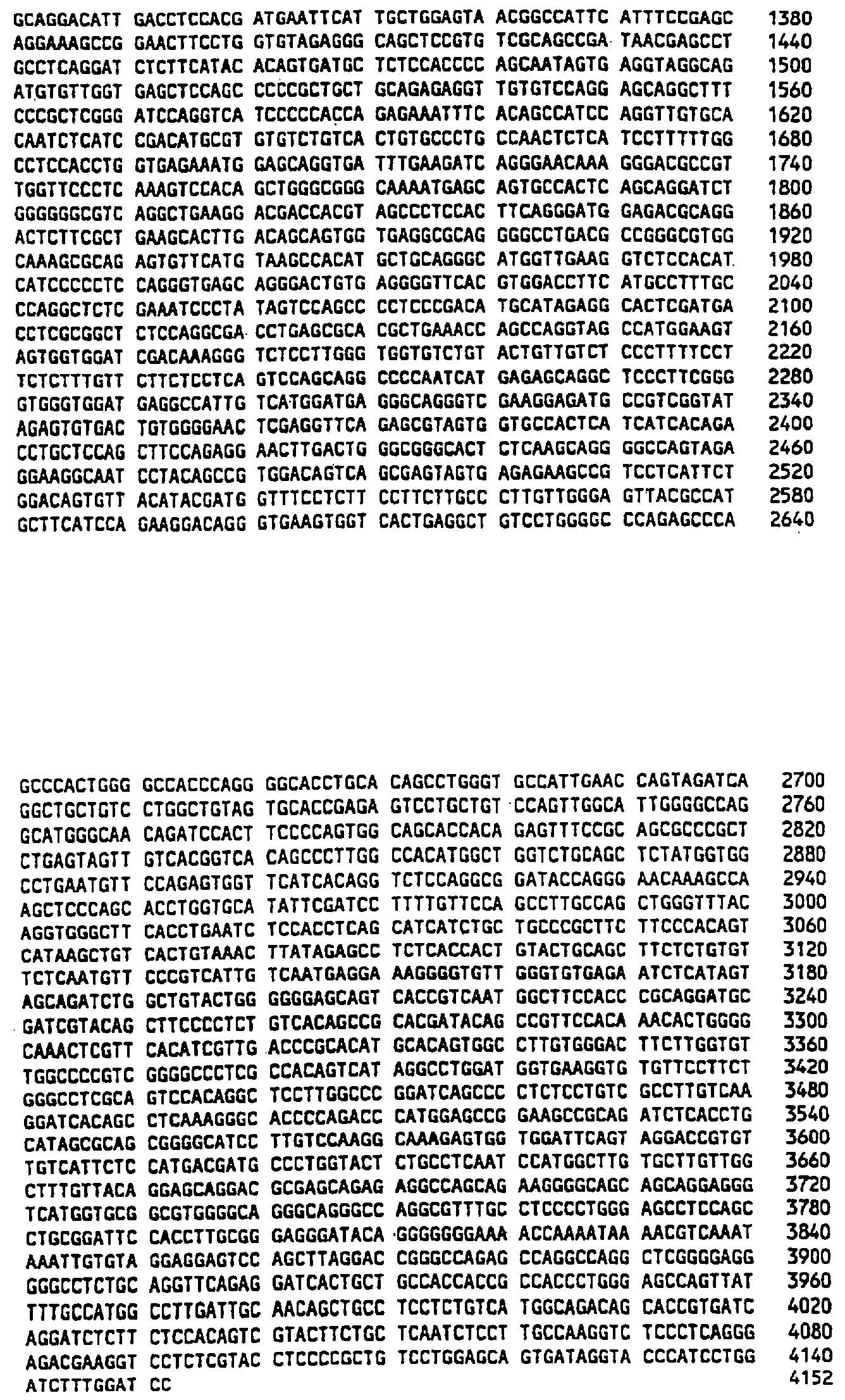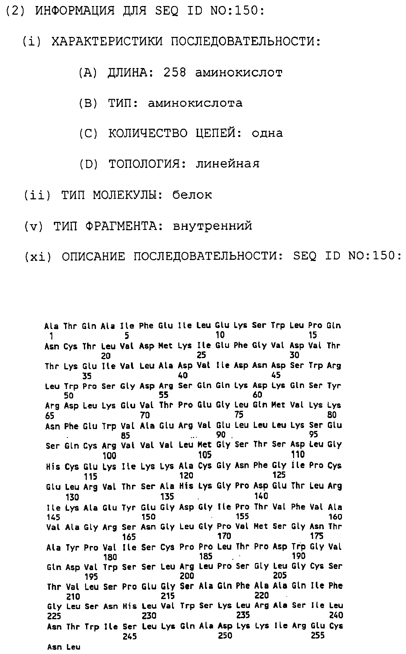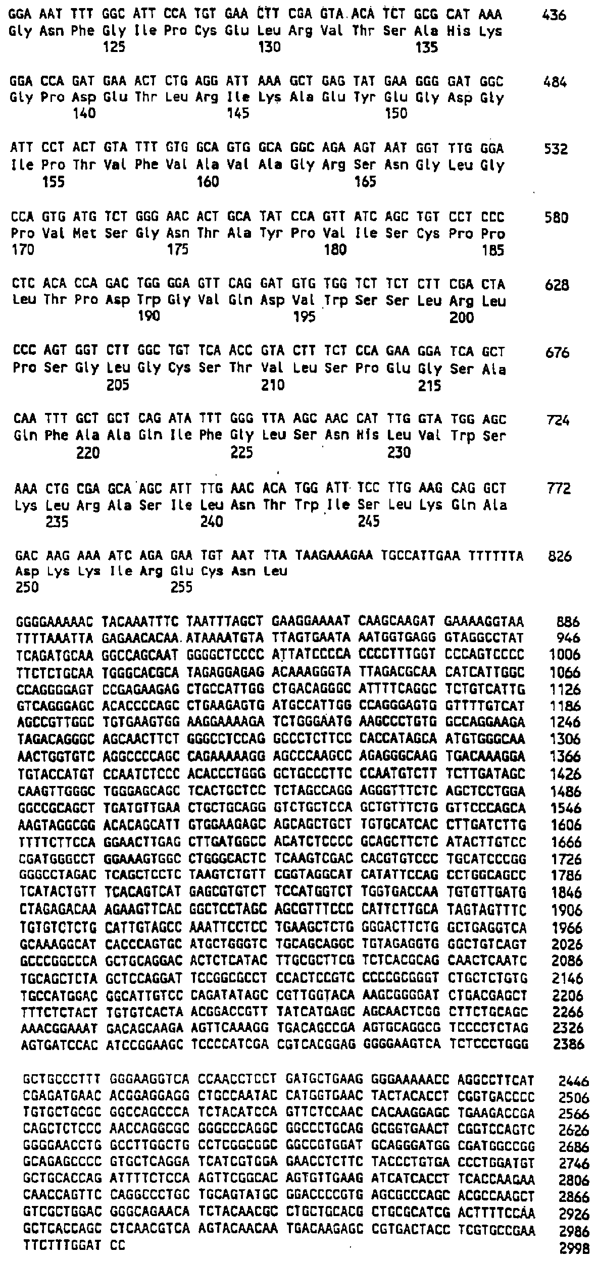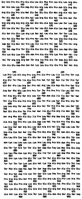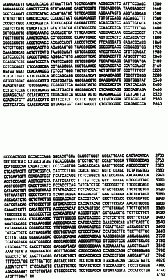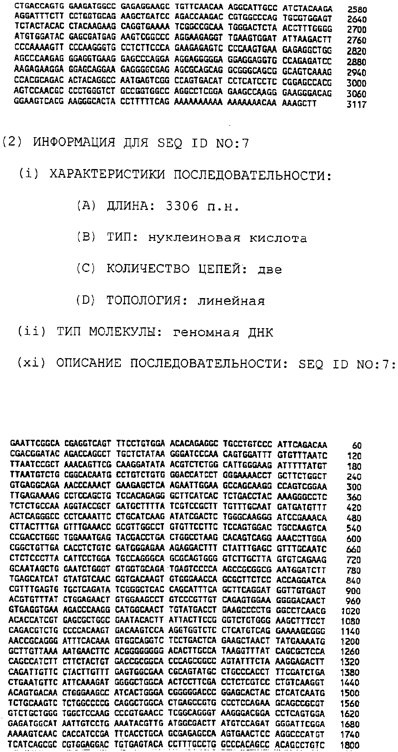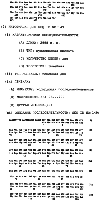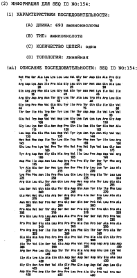 Клон Р2-10 (AIM7): Внутренние праймеры, использованные для секвенирования, показаны в SEQ ID NO:94-SEQ ID NO:106. Последовательность AIM7 представлена в SEQ ID NO:7. Самая длинная открытая рамка считывания (ORF) в последовательности AIM7 имеет длину 849 АА (аминокислот) и представлена в SEQ ID NO:152. BLAST-поиск выявил, что этот клон может быть родственным мРНК рецептора инсулиноподобного фактора роста II человека (Morgan et al. Nature 329:301-307, 1987 или мРНК катион-независимого рецептора маннозо-6-фосфата человека (Oshima et al. J. Biol. Chem. 263:2553-2562, 1988). Последовательность AIM7 показала примерно 99% идентичность обеим этим последовательностям на протяжении 2520 нуклеотидов, начиная с нуклеотида 12 SEQ ID NO:7, и 99% сходство с последней на том же самом протяжении.