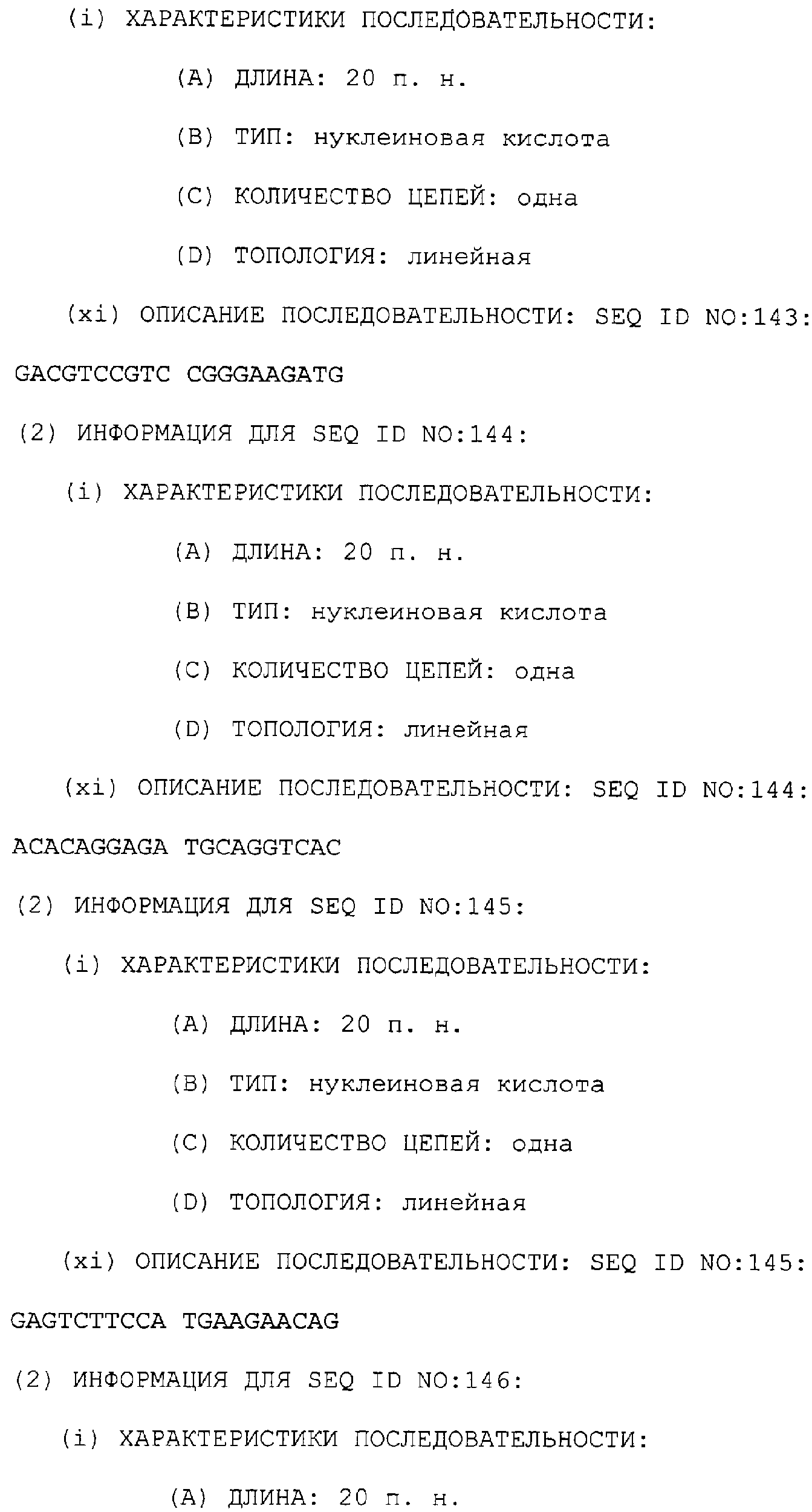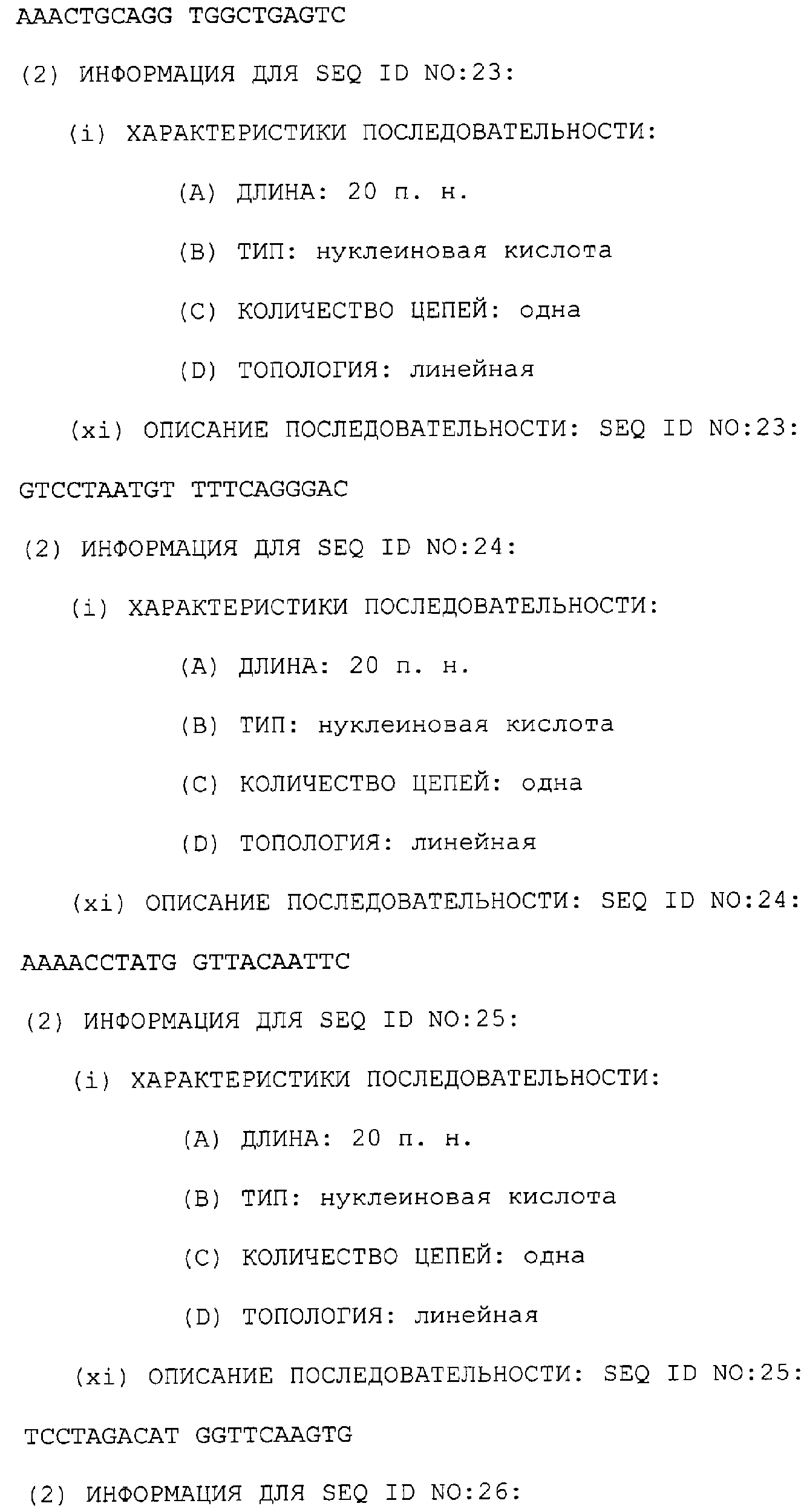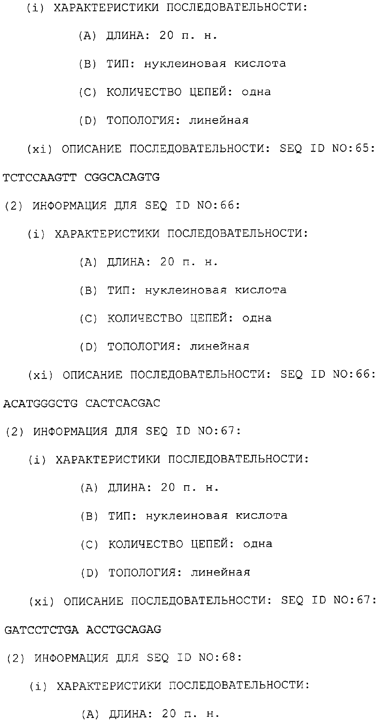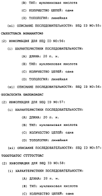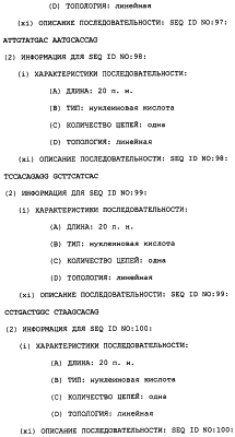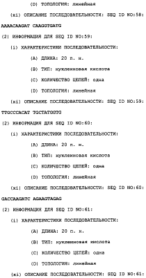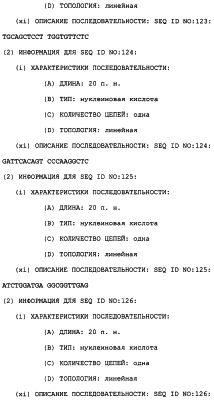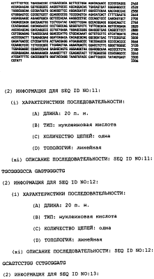 Полинуклеотиды данного изобретения могут быть также получены ПЦР-амплификацией матрицы с желательной последовательностью. Олигонуклеотидные праймеры, охватывающие желательную последовательность, отжигают с матрицей, удлиняют их ДНК-полимеразой и затем расплавляют при более высокой температуре таким образом, чтобы матрица и удлиненные олигонуклеотиды разъединились. Этот цикл повторяют до тех пор, пока не будет получено желательное количество амплифицируемого полинуклеотида (патенты США с номерами 4683195 и 4683202). Подходящие матрицы включают в себя библиотеку Т-клеток Jurkat и другие экспрессионные библиотеки человека и животных, которые содержат последовательности, кодирующие TRRE-модулятор. Библиотека Т-клеток Jurkat доступна из Американской коллекции типовых культур, 10801 University BLVD., Manassas VA 20110, U.S.A. (ATCC # TIB-152). Мутации и другие адаптации могут быть выполнены во время амплификации конструированием подходящих праймеров или могут быть включены после генетического сплайсинга.