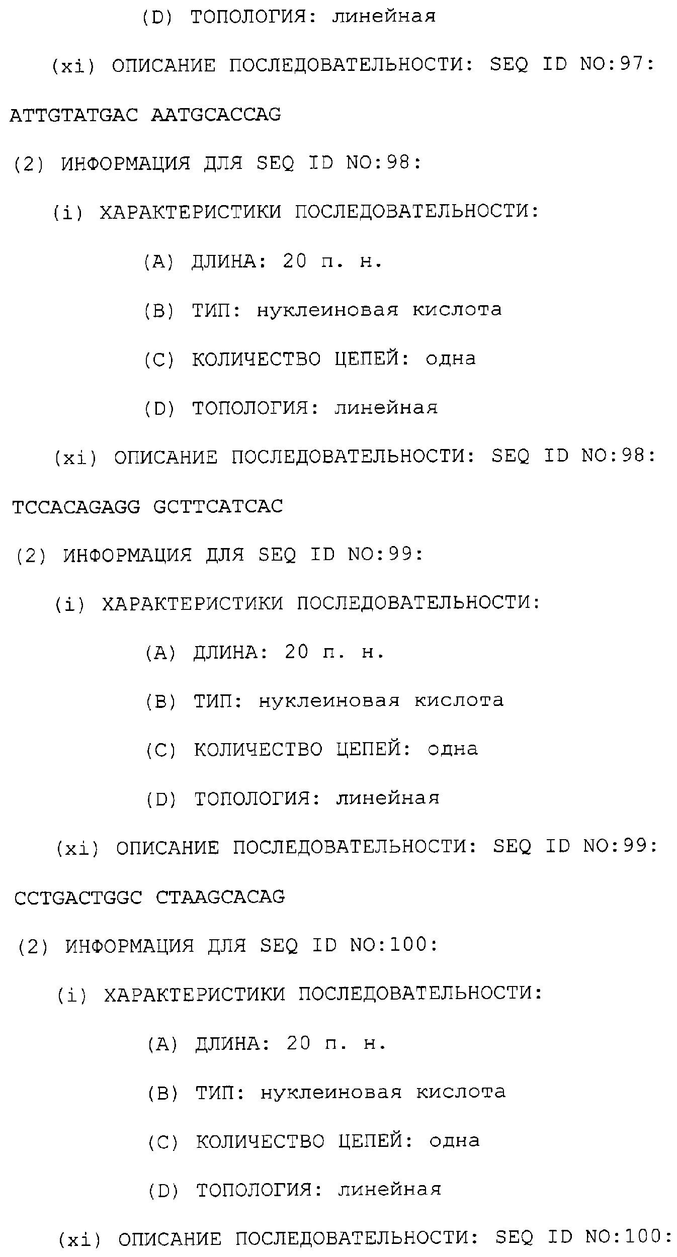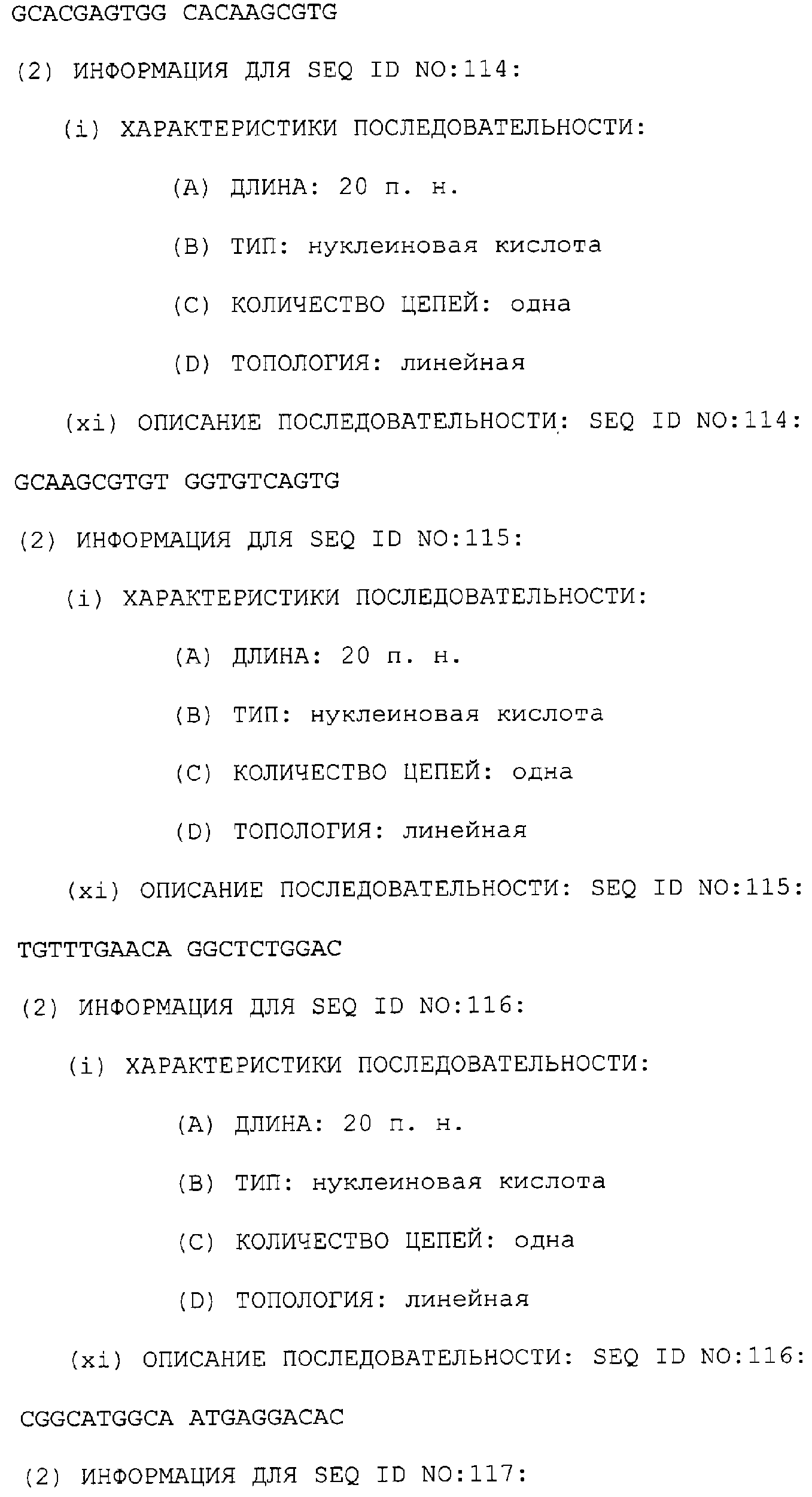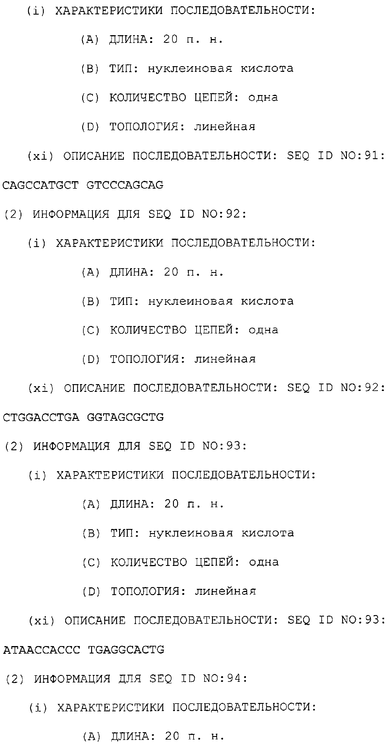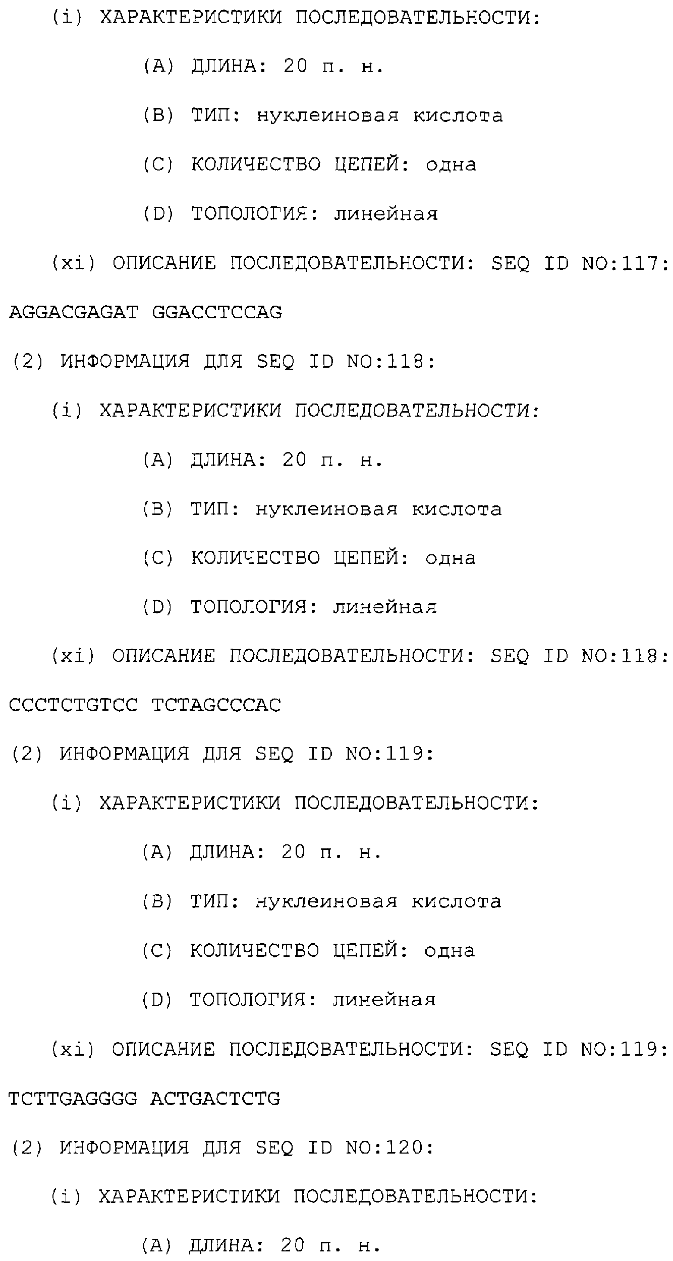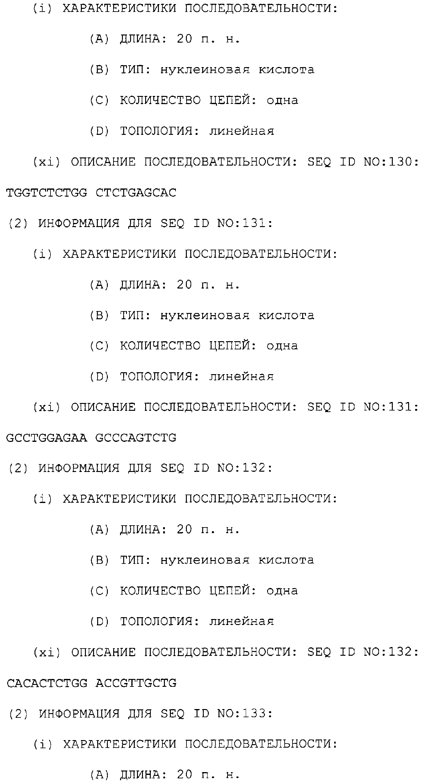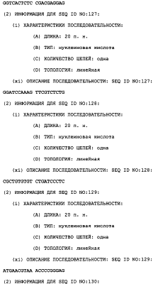Предпочтительные последовательности являются на 40%, 60%, 80%, 90% или 100% идентичными одной из последовательностей, приведенных в качестве примеров в этом описании; в порядке увеличения предпочтительности. Длина этой идентичной или гомологичной последовательности, сравниваемой с нативным полинуклеотидом человека, может быть приблизительно 7, 10, 15, 20, 30, 50 или 100 остатков в порядке увеличения предпочтительности, вплоть до длины всего кодирующего района.