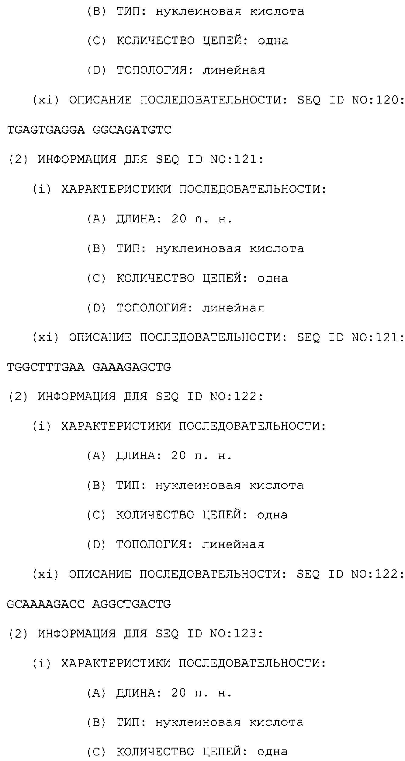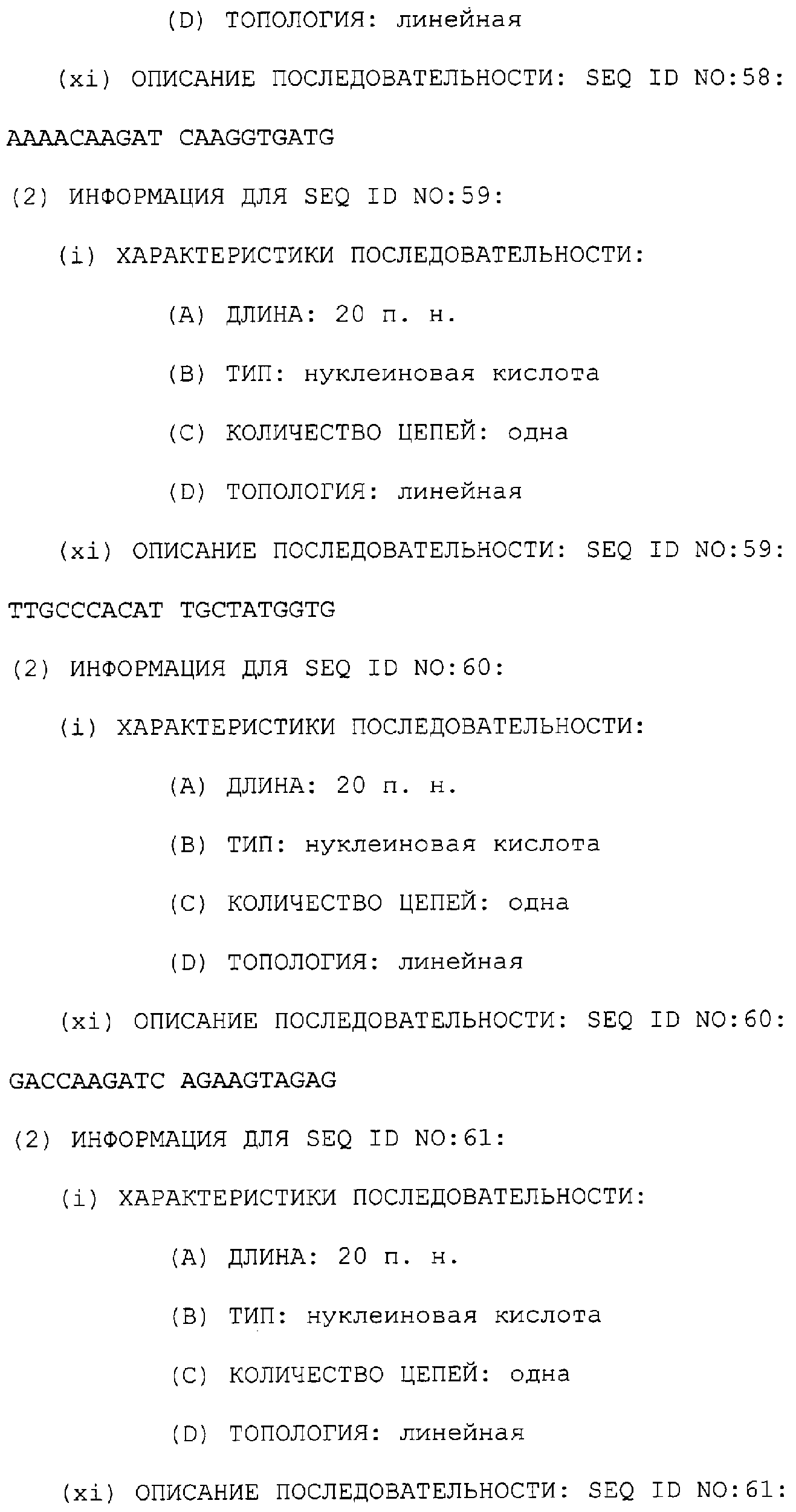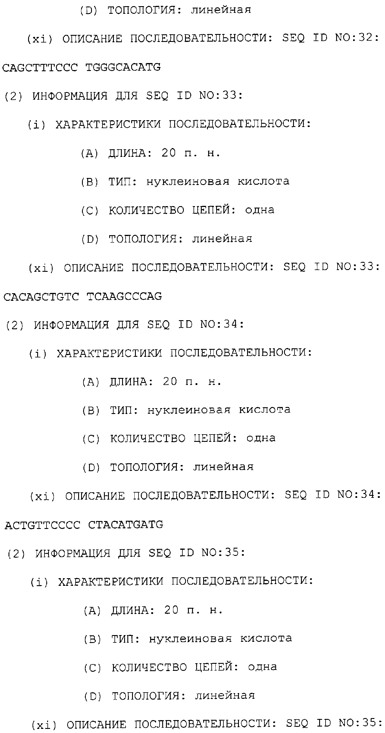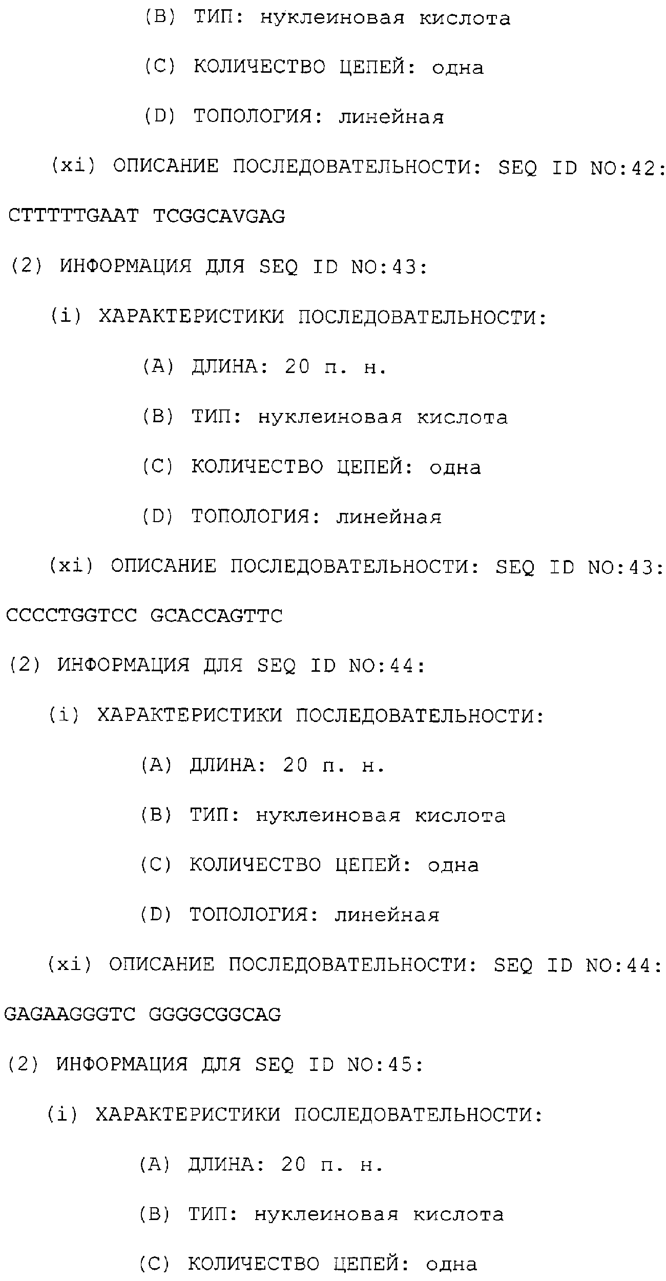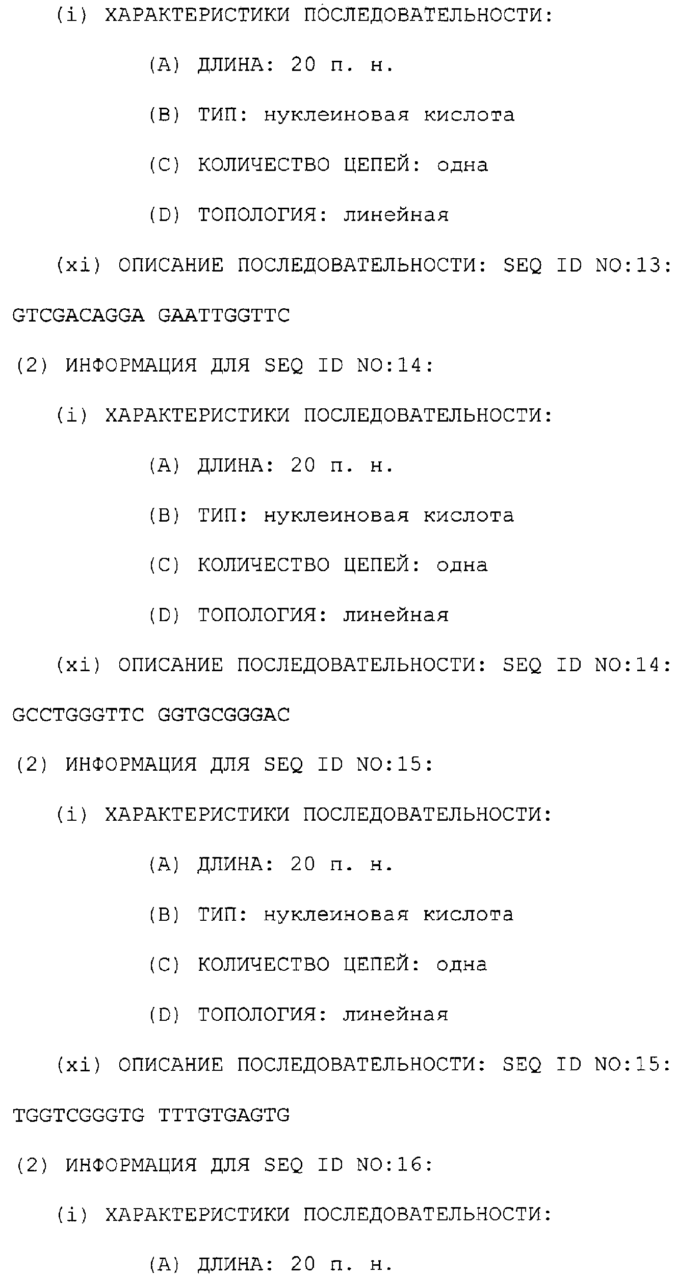 Предпочтительные последовательности являются на 40%, 60%, 80%, 90% или 100% идентичными одной из последовательностей, приведенных в качестве примеров в этом описании; в порядке увеличения предпочтительности. Длина этой идентичной или гомологичной последовательности, сравниваемой с нативным полинуклеотидом человека, может быть приблизительно 7, 10, 15, 20, 30, 50 или 100 остатков в порядке увеличения предпочтительности, вплоть до длины всего кодирующего района.