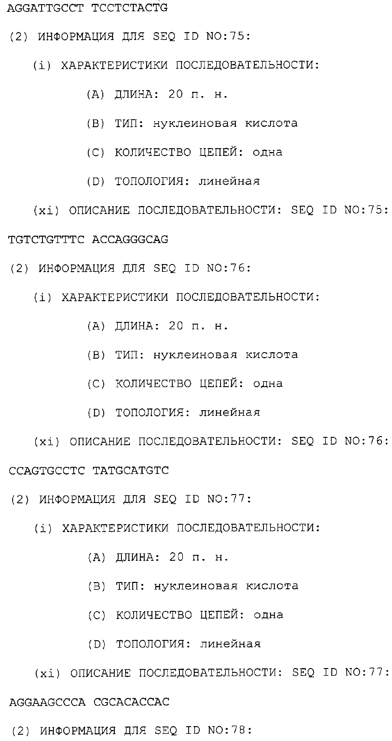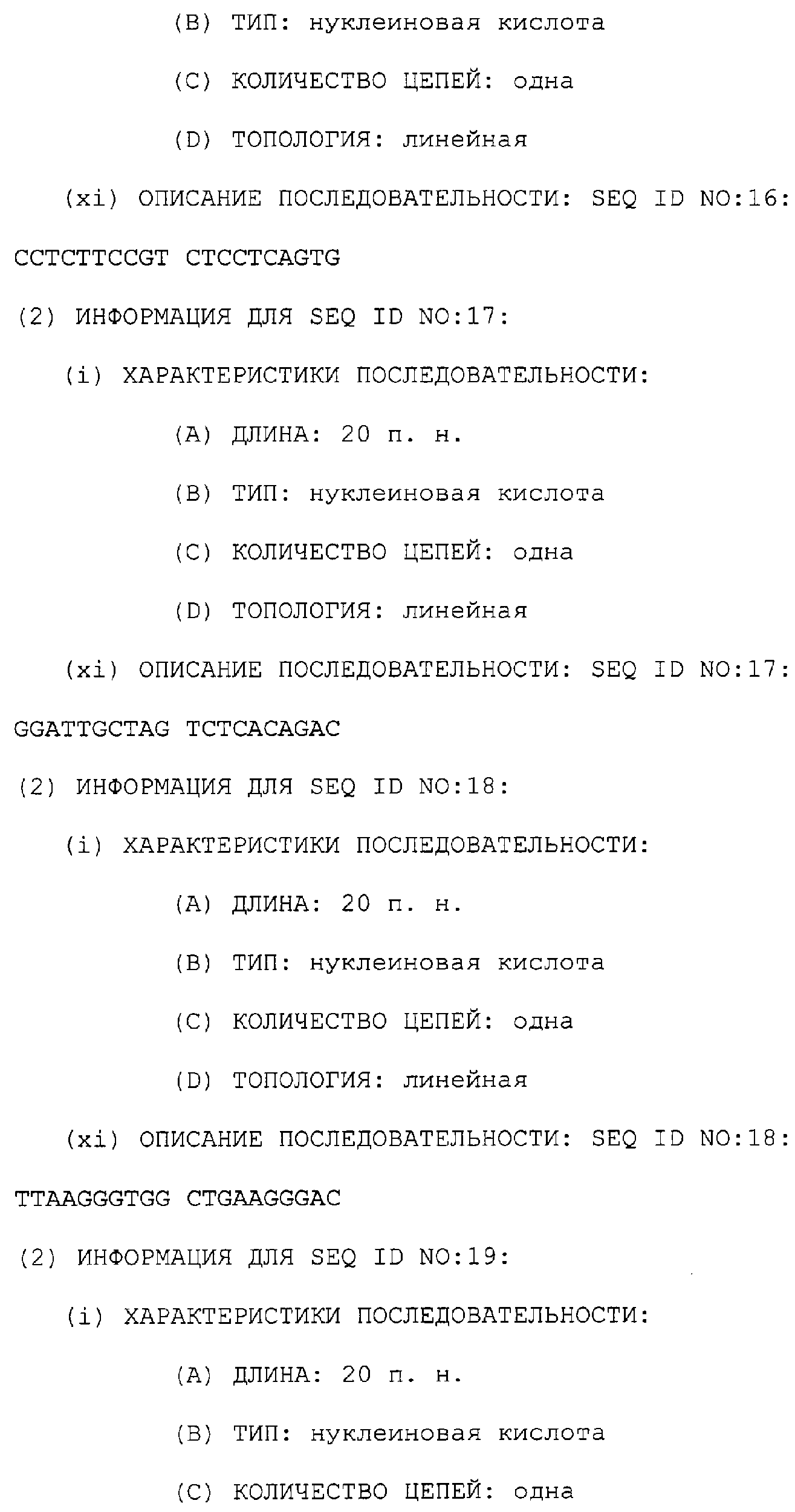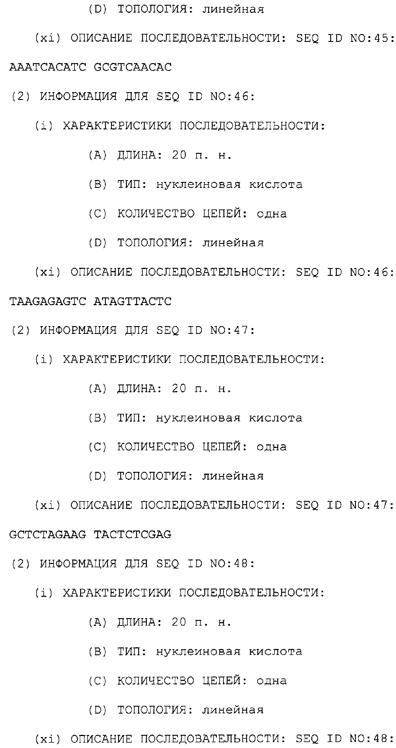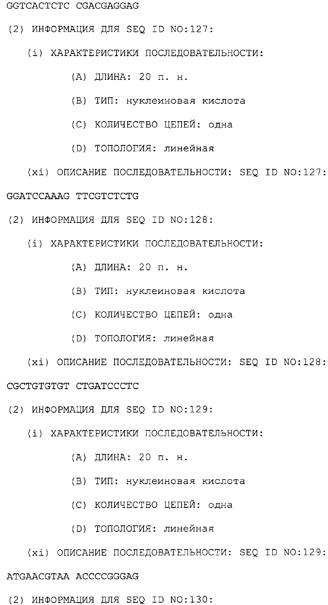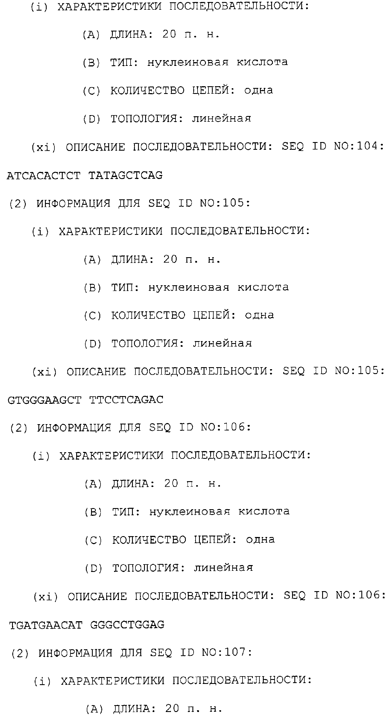 Предпочтительные последовательности являются на 40%, 60%, 80%, 90% или 100% идентичными одной из последовательностей, приведенных в качестве примеров в этом описании; в порядке увеличения предпочтительности. Длина этой идентичной или гомологичной последовательности, сравниваемой с нативным полинуклеотидом человека, может быть приблизительно 7, 10, 15, 20, 30, 50 или 100 остатков в порядке увеличения предпочтительности, вплоть до длины всего кодирующего района.
