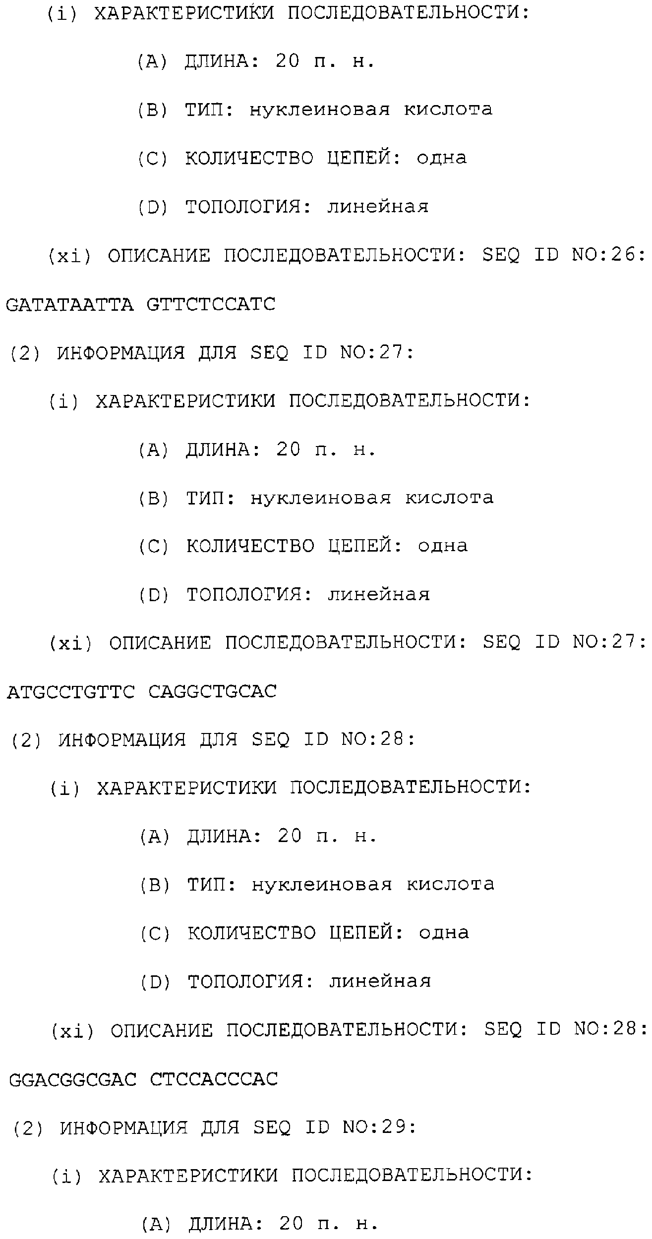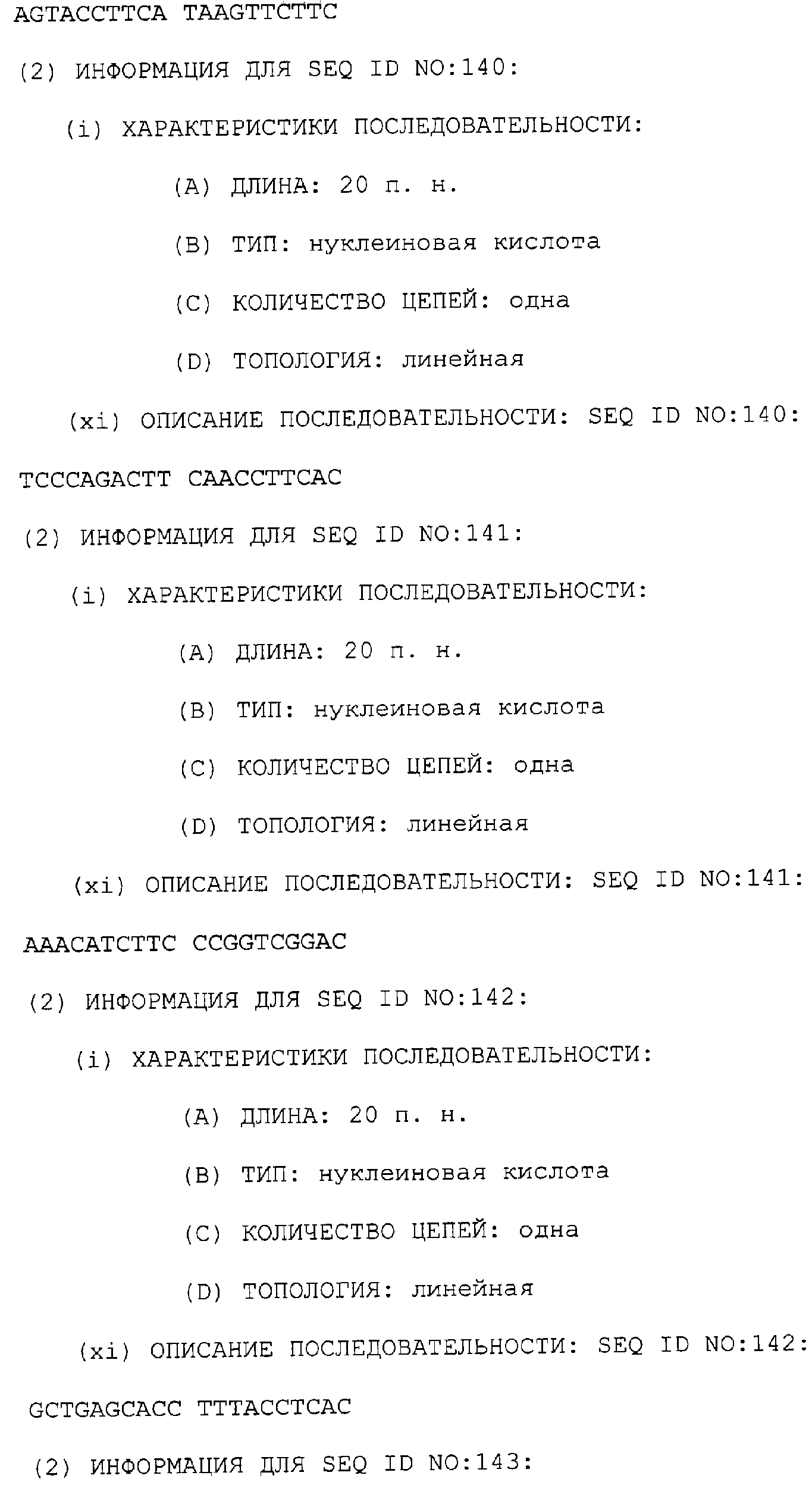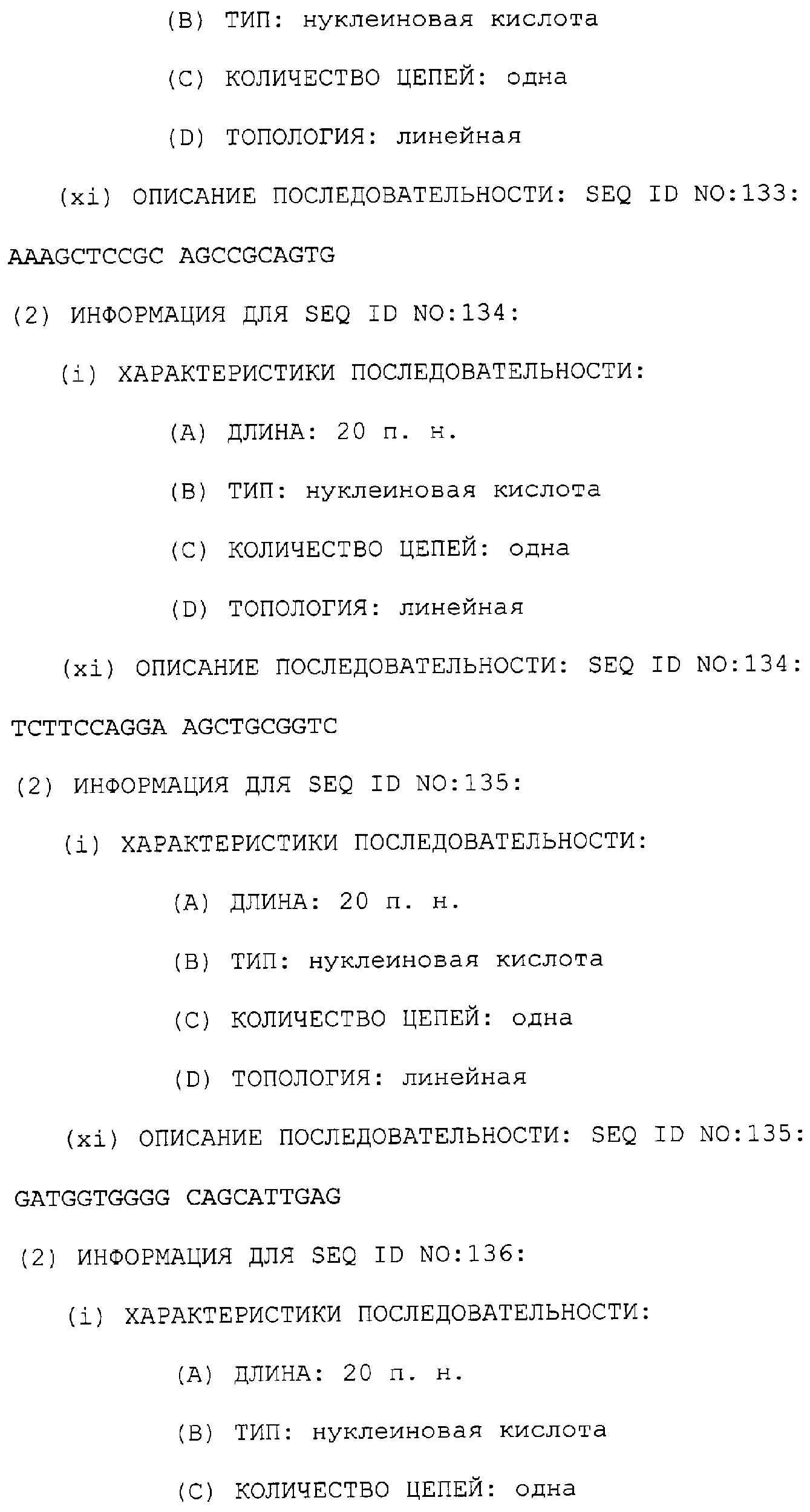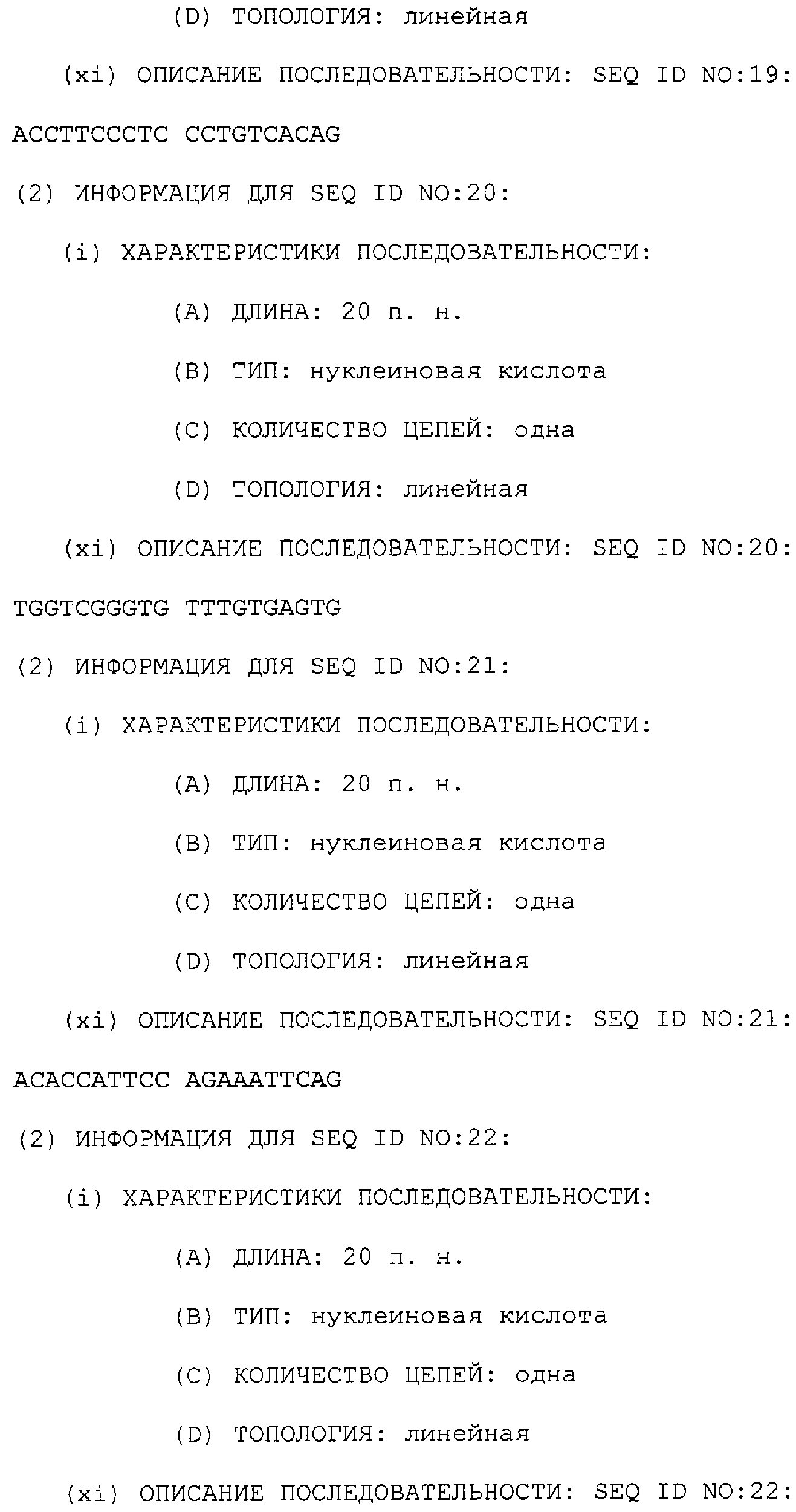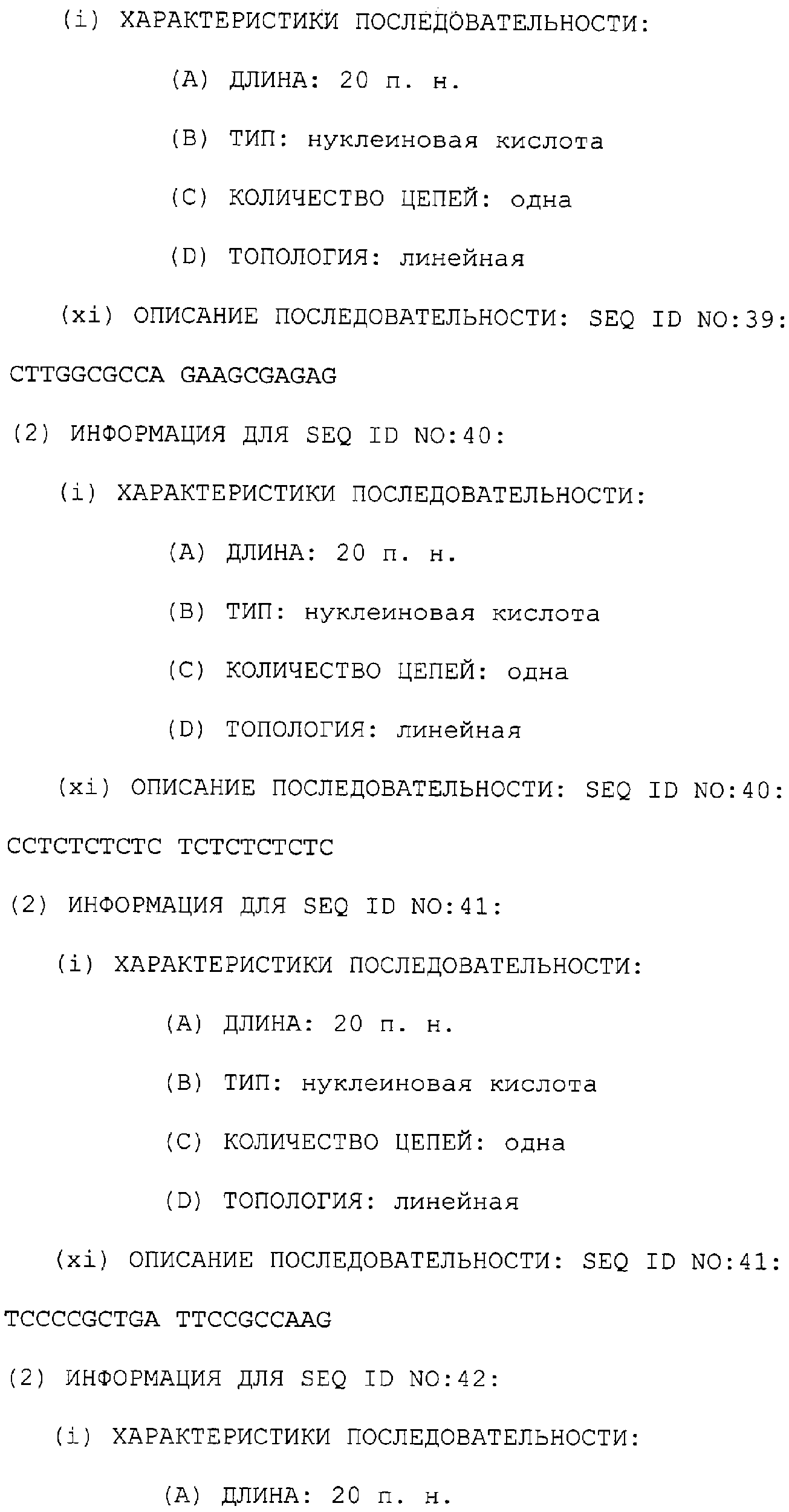 Предпочтительные последовательности являются на 40%, 60%, 80%, 90% или 100% идентичными одной из последовательностей, приведенных в качестве примеров в этом описании; в порядке увеличения предпочтительности. Длина этой идентичной или гомологичной последовательности, сравниваемой с нативным полинуклеотидом человека, может быть приблизительно 7, 10, 15, 20, 30, 50 или 100 остатков в порядке увеличения предпочтительности, вплоть до длины всего кодирующего района.