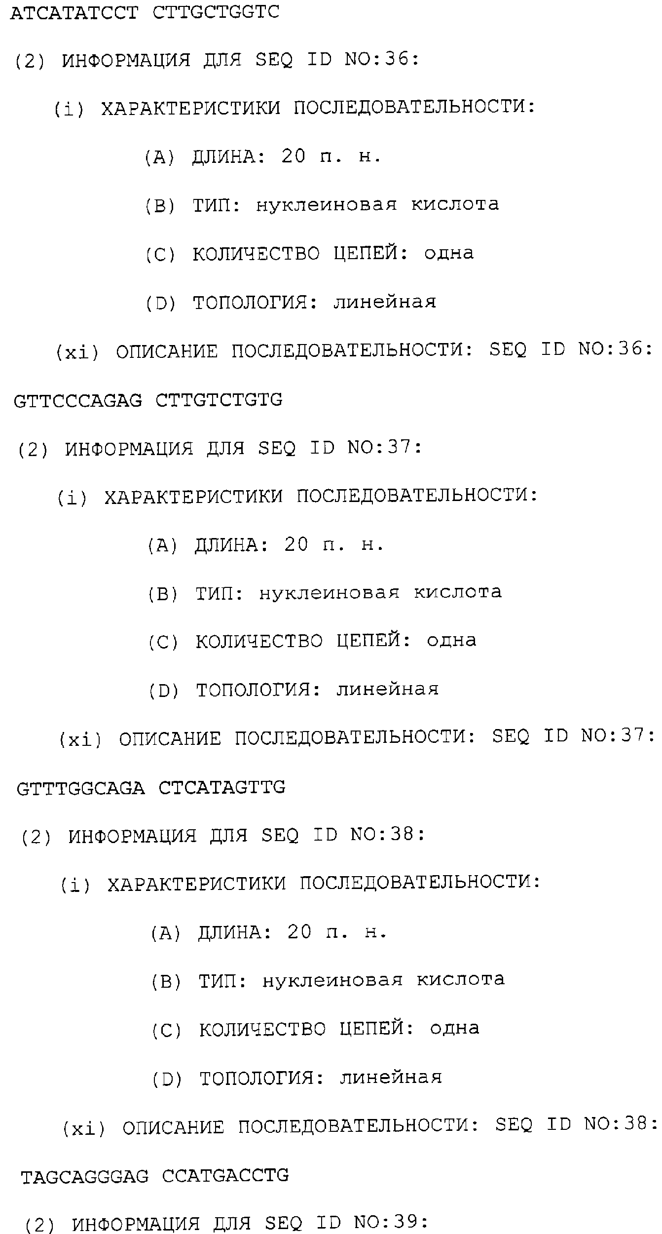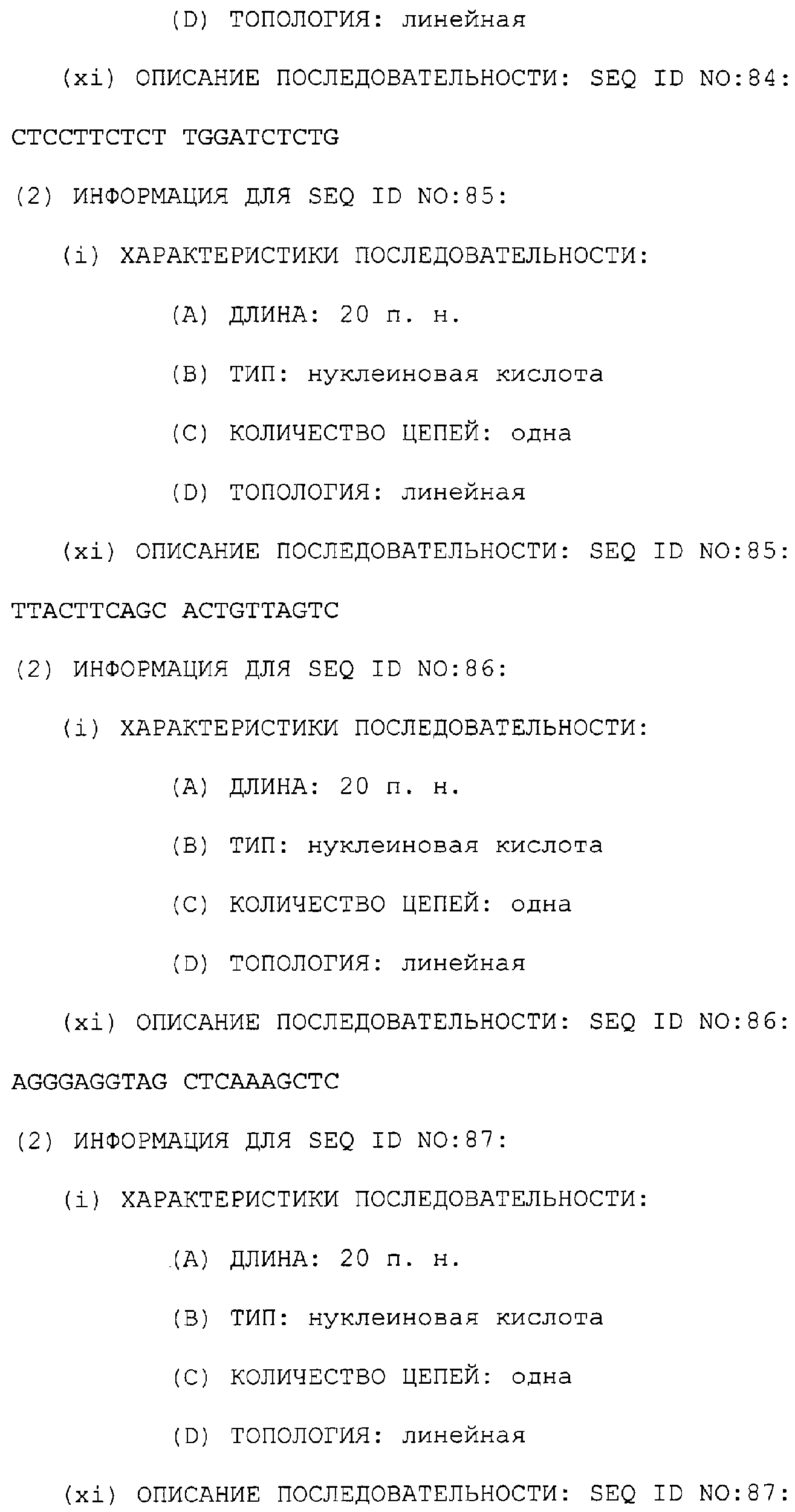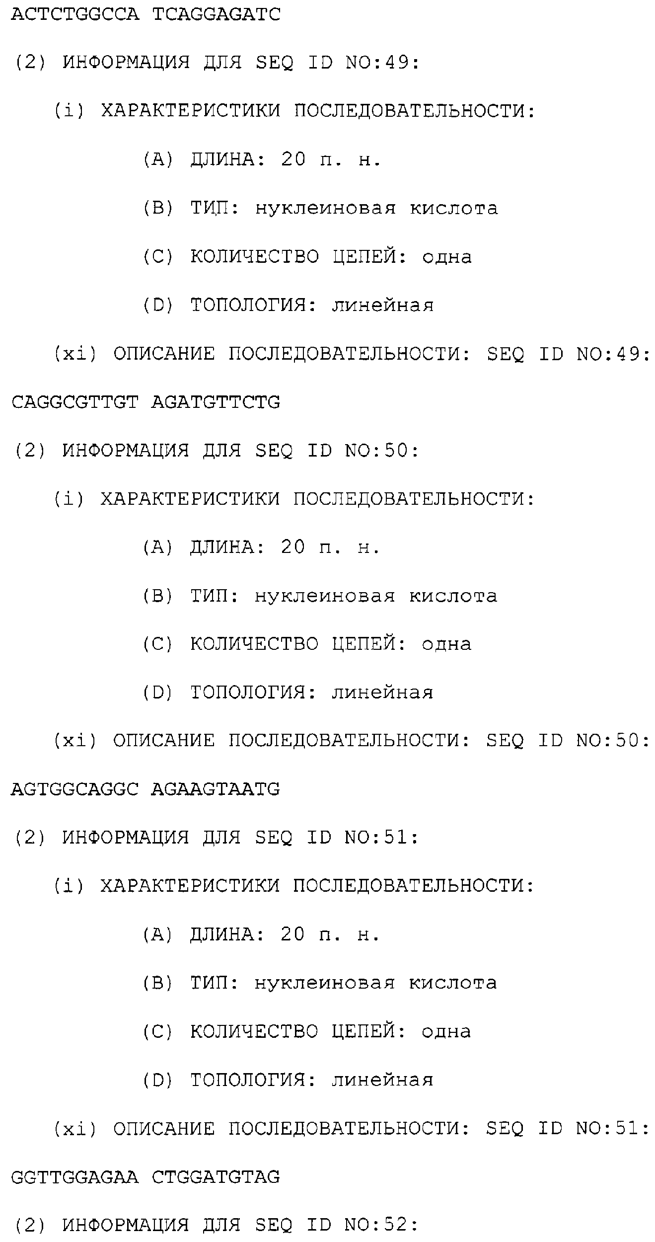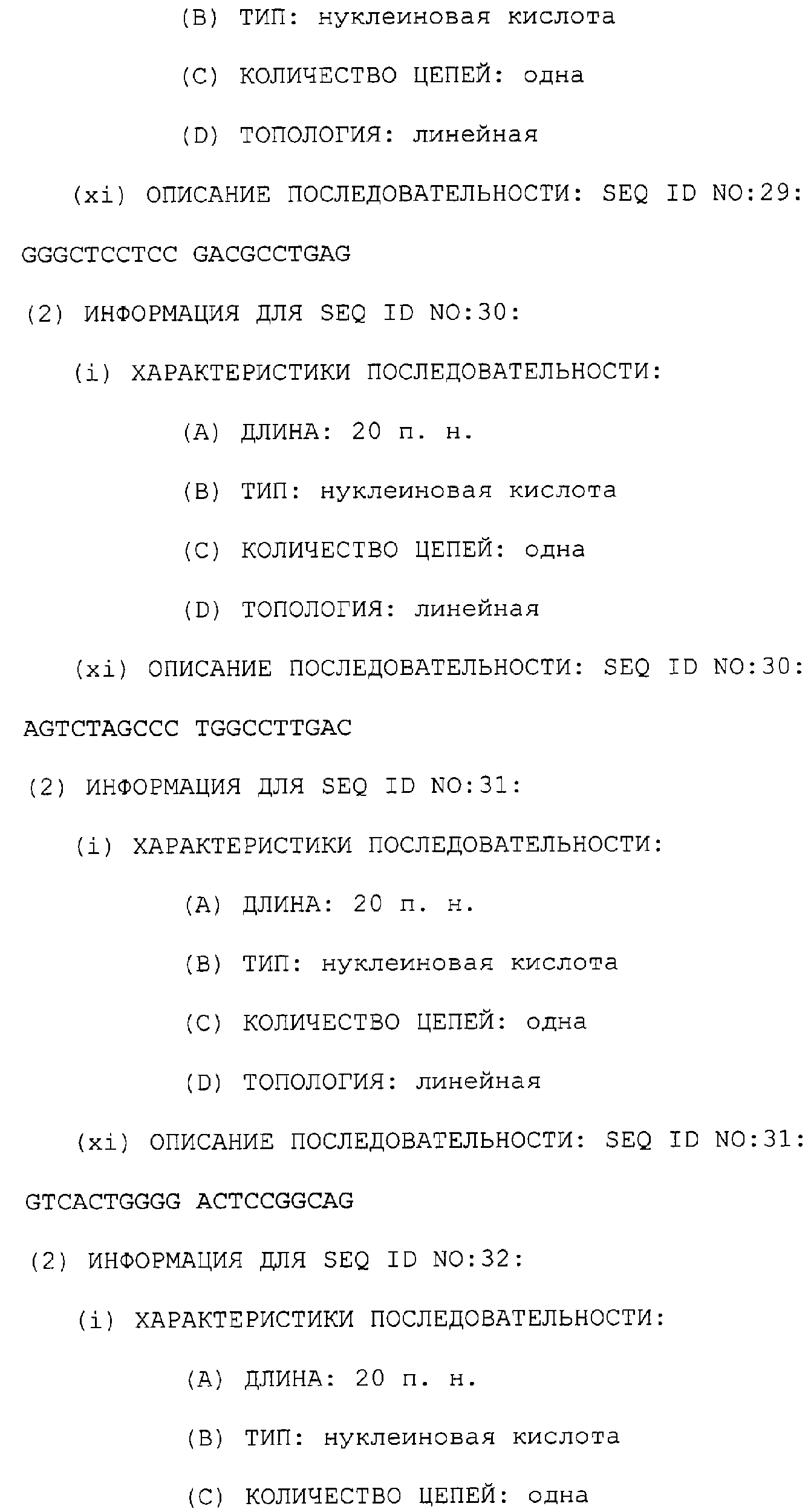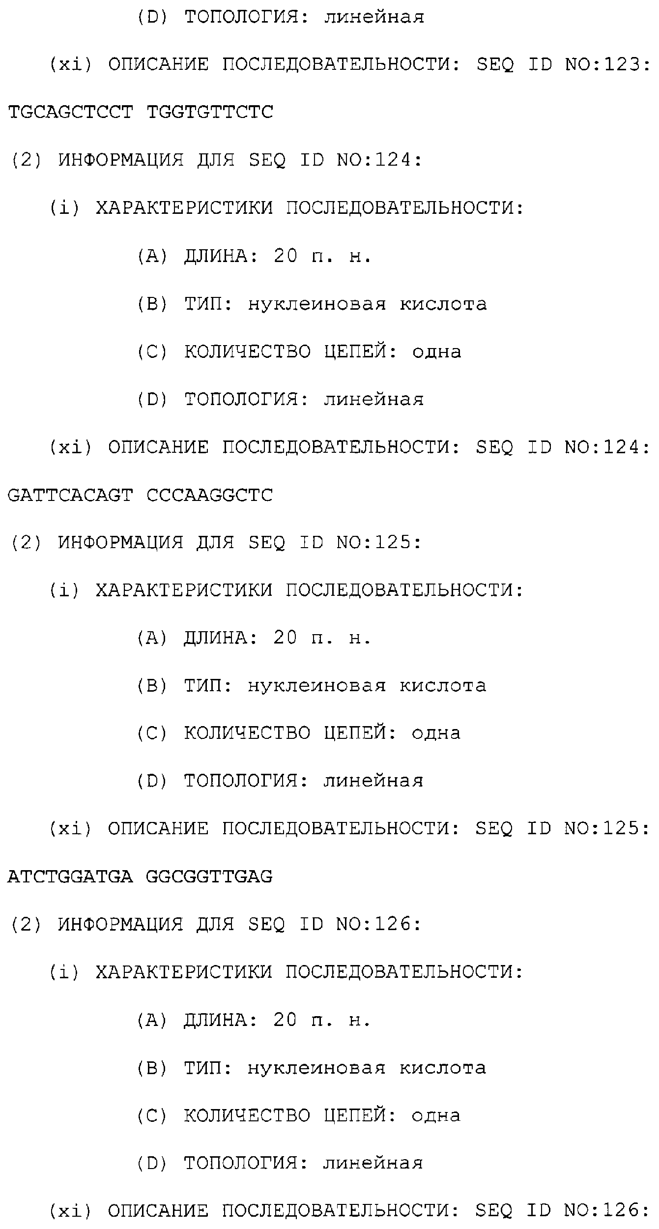 Предпочтительные последовательности являются на 40%, 60%, 80%, 90% или 100% идентичными одной из последовательностей, приведенных в качестве примеров в этом описании; в порядке увеличения предпочтительности. Длина этой идентичной или гомологичной последовательности, сравниваемой с нативным полинуклеотидом человека, может быть приблизительно 7, 10, 15, 20, 30, 50 или 100 остатков в порядке увеличения предпочтительности, вплоть до длины всего кодирующего района.
