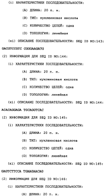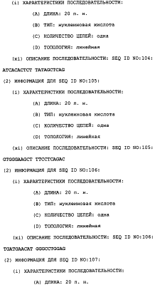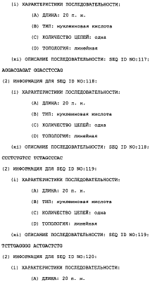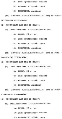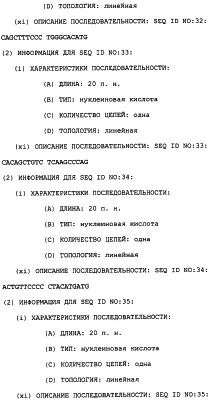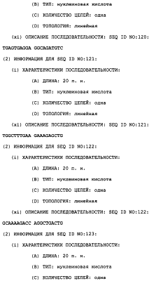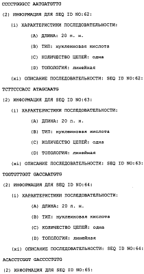 Полинуклеотиды данного изобретения могут быть использованы для измерения измененной активности TRRE в пробе клеток или ткани. Это предусматривает контактирование пробы с полинуклеотидом в условиях, позволяющих полинуклеотиду гибридизоваться специфически с нуклеиновой кислотой, которая кодирует модулятор TRRE-активности, если она присутствует в этой пробе, и определение полинуклеотида, который гибридизовался, как результата стадии а). Специфичность этого теста может быть обеспечена несколькими путями. Один способ предусматривает использование специфического зонда – полинуклеотида данного изобретения с последовательностью, достаточно длинной и достаточно идентичной детектируемой последовательности, так что он связывает эту мишень, но не другую нуклеиновую кислоту, которая может присутствовать в этой пробе. Этот зонд обычно является меченым (либо непосредственно, либо посредством вторичного реагента), так что он может быть затем детектирован. Подходящие метки включают в себя 32P и 33Р, хемилюминесцентные и флуоресцентные реагенты. После реакции гибридизации непрореагировавший зонд отмывают, так чтобы можно было определить количество гибридизованного зонда. Сигнал может быть усилен с использованием разветвленных зондов (патент США с номером 5124246). В другом способе полинуклеотид является праймером для реакции ПЦР. Специфичность обеспечивается способностью спаренных зондов амплифицировать представляющую интерес последовательность. После подходящего числа ПЦР-циклов количество присутствующего амплифицированного продукта коррелирует с количеством последовательности-мишени, исходно присутствующей в этой пробе.