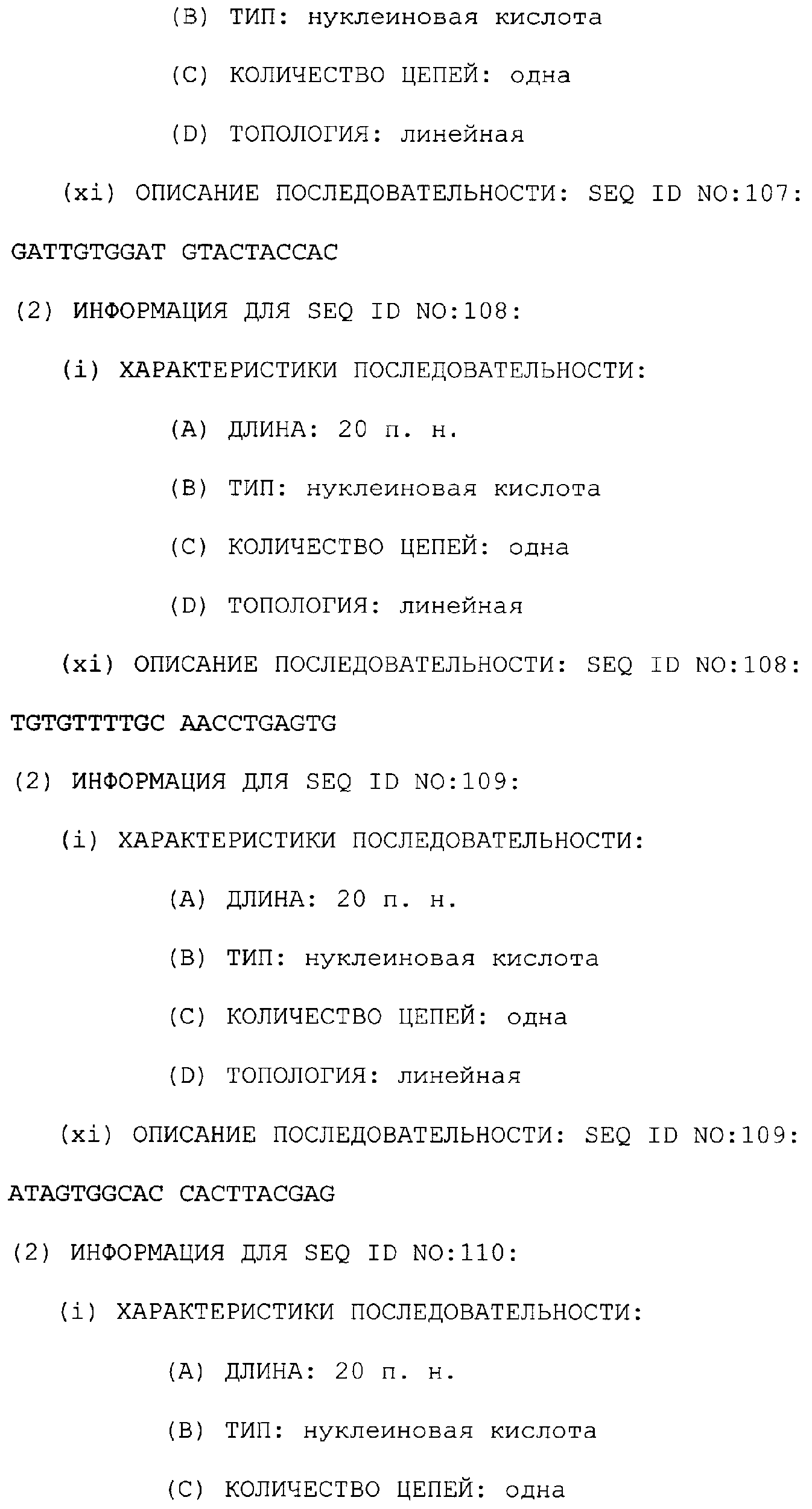 Термин “полинуклеотид” относится к полимерной форме нуклеотидов любой длины, либо дезоксирибонуклеотидов, либо рибонуклеотидов, или их аналогов. Полинуклеотиды могут иметь трехмерную структуру и могут выполнять любую функцию, известную или неизвестную. Далее приведены неограничительные примеры полинуклеотидов: ген или фрагмент гена, экзоны, интроны, (мРНК), рибозимы, кДНК, рекомбинантные полинуклеотиды, разветвленные полинуклеотиды, плазмиды, векторы, зонды нуклеиновых кислот и праймеры. Полинуклеотид может содержать модифицированные нуклеотиды, такие как метилированные нуклеотиды и аналоги нуклеотидов. В случае их присутствия, модификации нуклеотидной структуры могут быть произведены до или после сборки полимера. Термин полинуклеотид обозначает взаимозаменяемо двух- и одноцепочечные молекулы. Если нет иных указаний или требований, любой вариант данного изобретения, описанный здесь, который является полинуклеотидом, включает как двухцепочечную форму, так и каждую из двух комплементарных одноцепочечных форм, известных или предполагаемых для образования данной двухцепочечной формы.