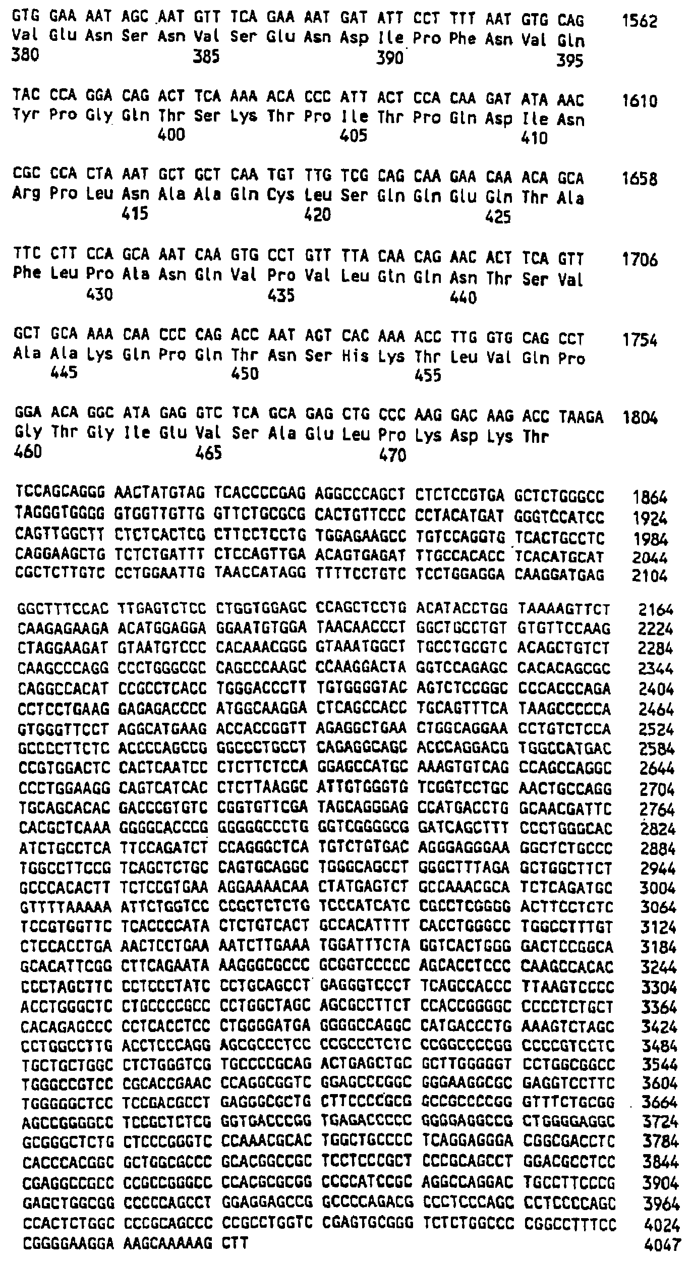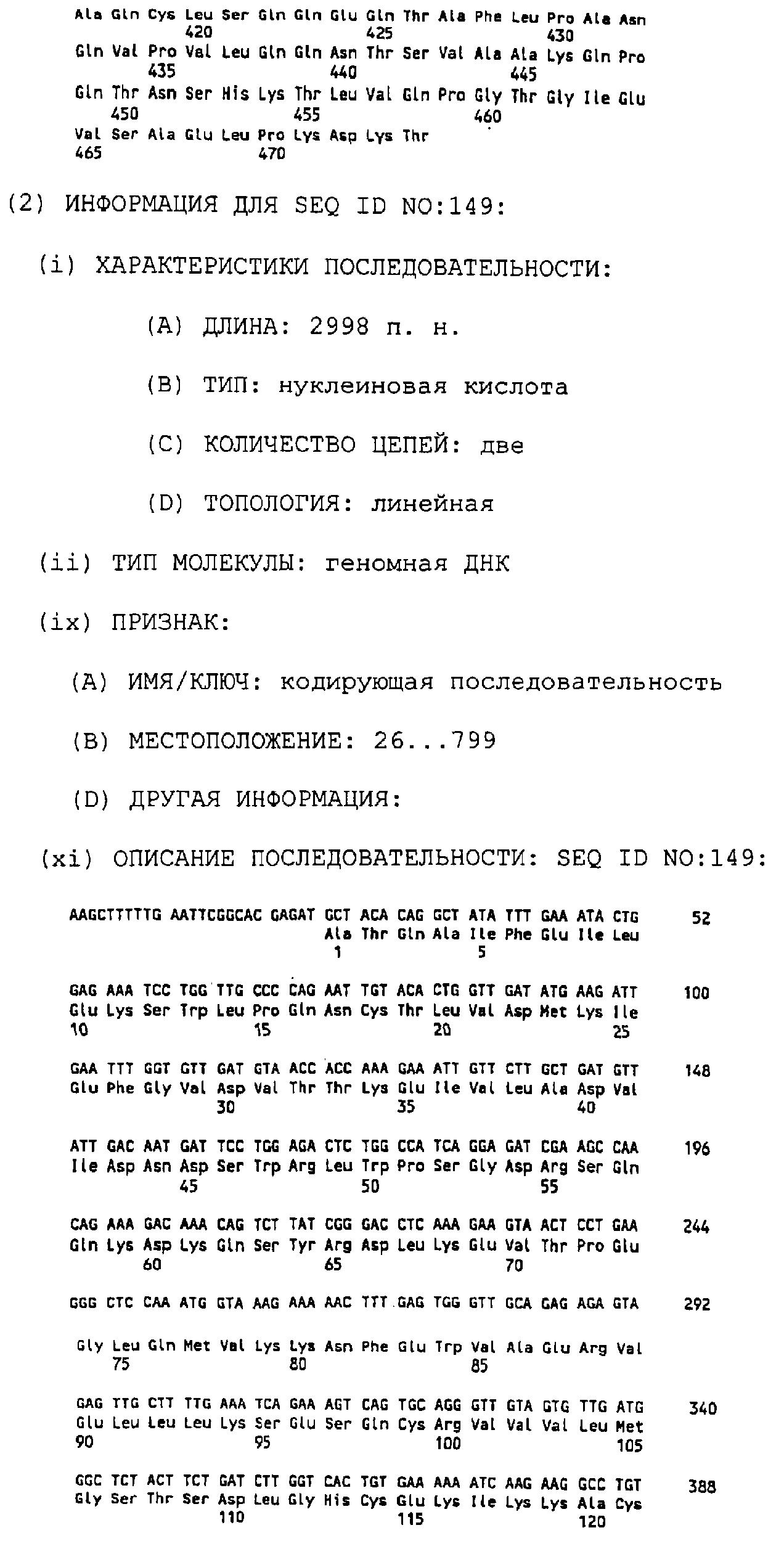 Клон 2-9 (AIM2): Внутренние праймеры, использованные для секвенирования, показаны в SEQ ID NO:11-SEQ ID NO:38. Последовательность AIM2 представлена в SEQ ID NO:1. Комплементарная цепь последовательности AIM2 представляет собой SEQ ID NO:147. Самая длинная открытая рамка считывания (ORF) в последовательности AIM2 имеет длину 474 АА (аминокислоты) и представлена в SEQ ID NO:148.