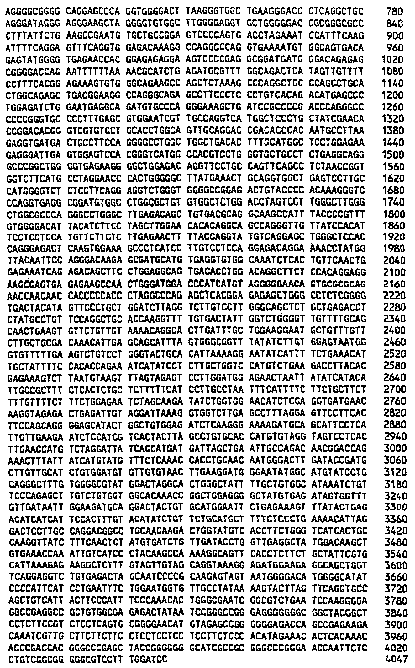 Клон 2-8 (AIM3): Две частичные последовательности с длиной 739 и 233 были получены и обозначены AIM3T3 и AIM3T7. Внутренние праймеры, использованные для секвенирования, показаны в SEQ ID NO:39-SEQ ID NO:46. Последовательности AIM3T3 и AIM3T7 представлены в SEQ ID NO:2 и SEQ ID NO:3 соответственно. BLAST-поиск выявил, что последовательность AIM3T3 может быть гомологичной рибосомной РНК 28S мыши (М. musculus) (Hassouna et al. Nucleic Acids Res. 12:3563-3583, 1984) и генам пре-рРНК 45S М. musculus (номер доступа Х82564). Комплементарная последовательность последовательности AIM3T3 обнаружила 99% сходство на протяжении 408 п.н., начиная с нуклеотида 221 SEQ ID NO:2, с первой и 97% сходство на том же самом протяжении с последней.