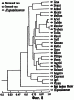 Для TEM-1, ТЕМ-10, а также объединенных данных для двух праймеров, строили матрицы с применением коэффициента Nei и Li (Nei and Li, см. выше). Для тех же групп результатов строили дендрограммы. Дендрограмма объединенных данных для ТЕМ-1 и ТЕМ-10 представлена на фиг.8. Дендрограмма четко отделяет линию Н. spontaneum от сортов Н. vulgare. За исключением Azhul (шестирядный тип), весенние двухрядные типы кластеризовались друг с другом и отделялись от 4 зимних типов (Angora, Express, Igri и Vixen), включенных в настоящее изобретение. Кластеризуемая с зимними двурядными сортами линия High Amylose Glacier относится к шестирядному типу. Сравнение матрикса GS с таковым, полученным ранее с помощью анализа RFLP, показало хорошую корреляцию между ними с Z=0,69475 по статистическому способу Mantel. Данная положительная корреляция имела высокую достоверность с вероятностью Р=0,0020 того, что данная величина Z могла бы быть получена случайно.