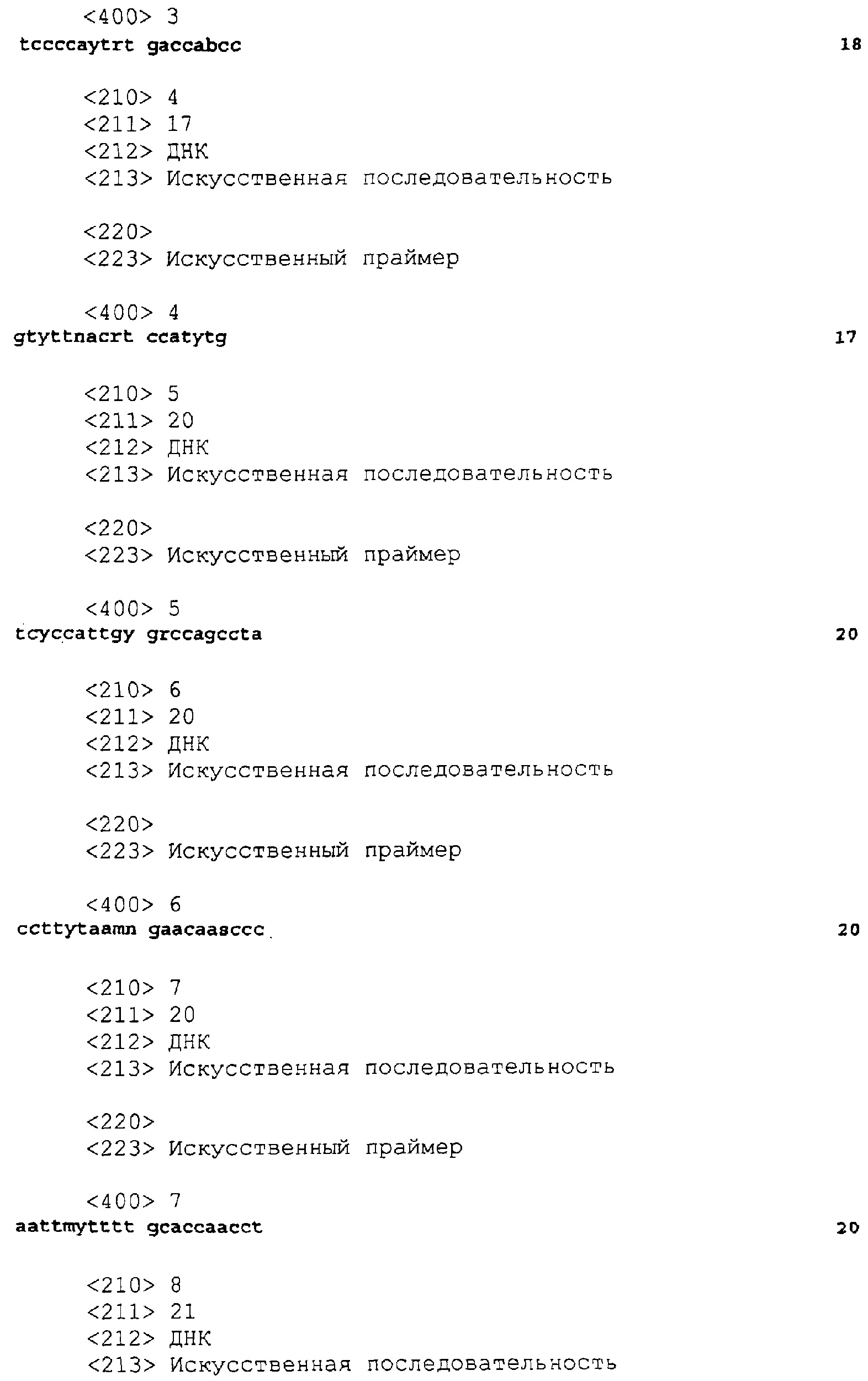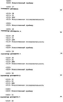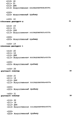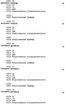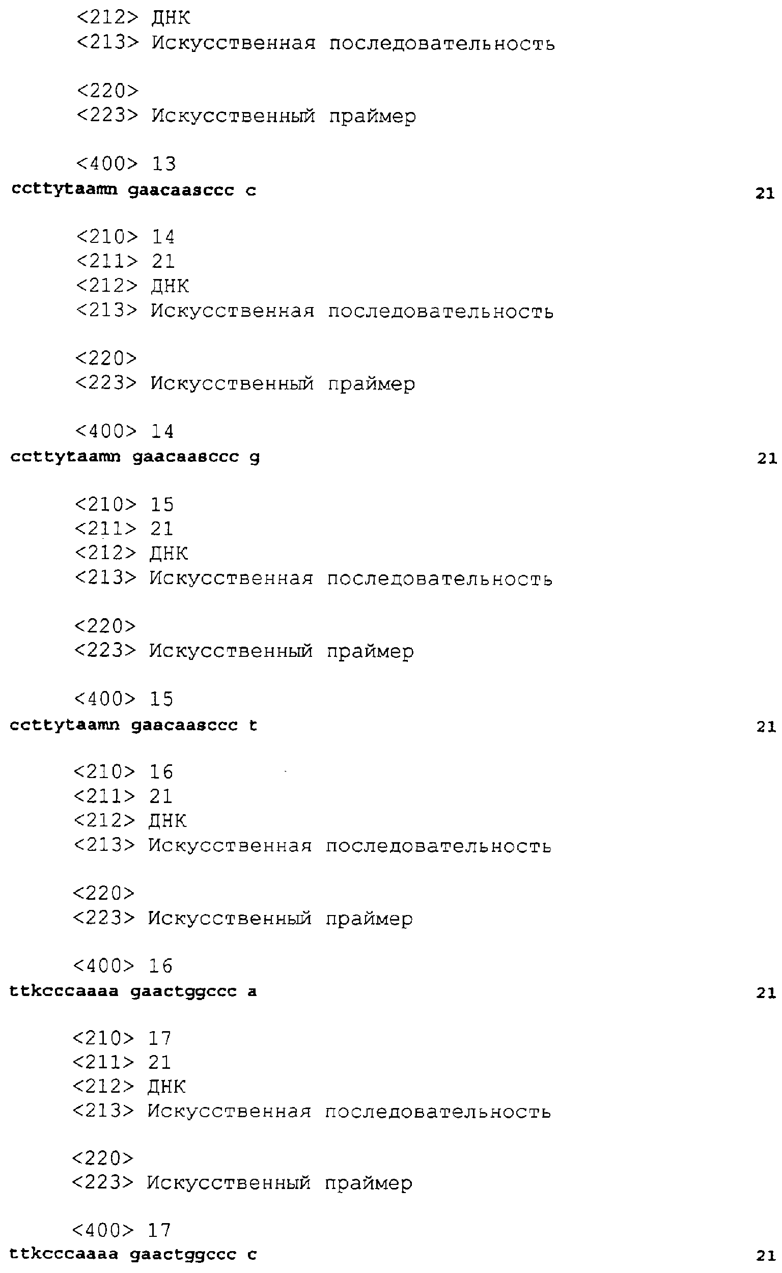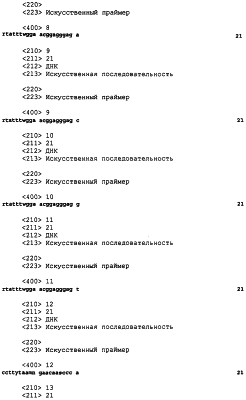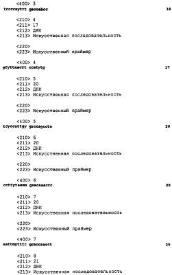 3. Способ по любому из п.1 или 2, где последовательность нуклеиновой кислоты указанного праймера выбрана из группы, включающей SEQ ID NO: 1, SEQ ID NO: 2, SEQ ID NO: 3, SEQ ID NO: 4, SEQ ID NO: 5, SEQ ID NO: 6, SEQ ID NO: 7, SEQ ID NO: 8, SEQ ID NO: 9, SEQ ID NO: 10, SEQ ID NO: 11, SEQ ID NO: 12, SEQ ID NO: 13, SEQ ID NO: 14, SEQ ID NO:15, SEQ ID NO: 16, SEQ ID NO: 17, SEQ ID NO: 18, SEQ ID NO: 19, SEQ ID NO: 20, SEQ ID NO: 21, SEQ ID NO: 22, SEQ ID NO: 23, SEQ ID NO: 24, SEQ ID NO: 25, SEQ ID NO: 26, SEQ ID NO: 27, SEQ ID NO: 28, SEQ ID NO: 29, SEQ ID NO: 30, SEQ ID NO: 31, SEQ ID NO: 32, SEQ ID NO: 33, SEQ ID NO: 34 и SEQ ID NO: 35.