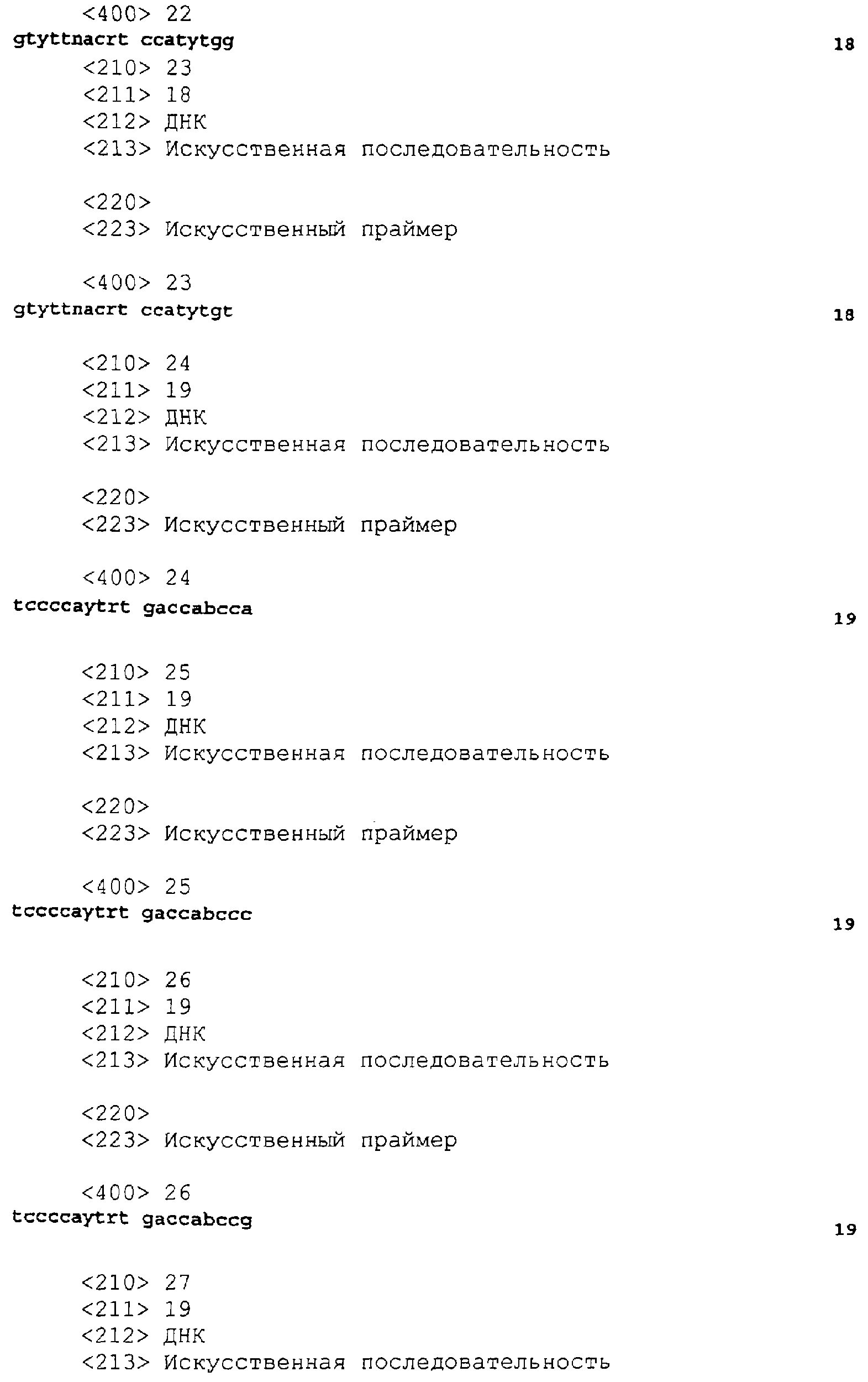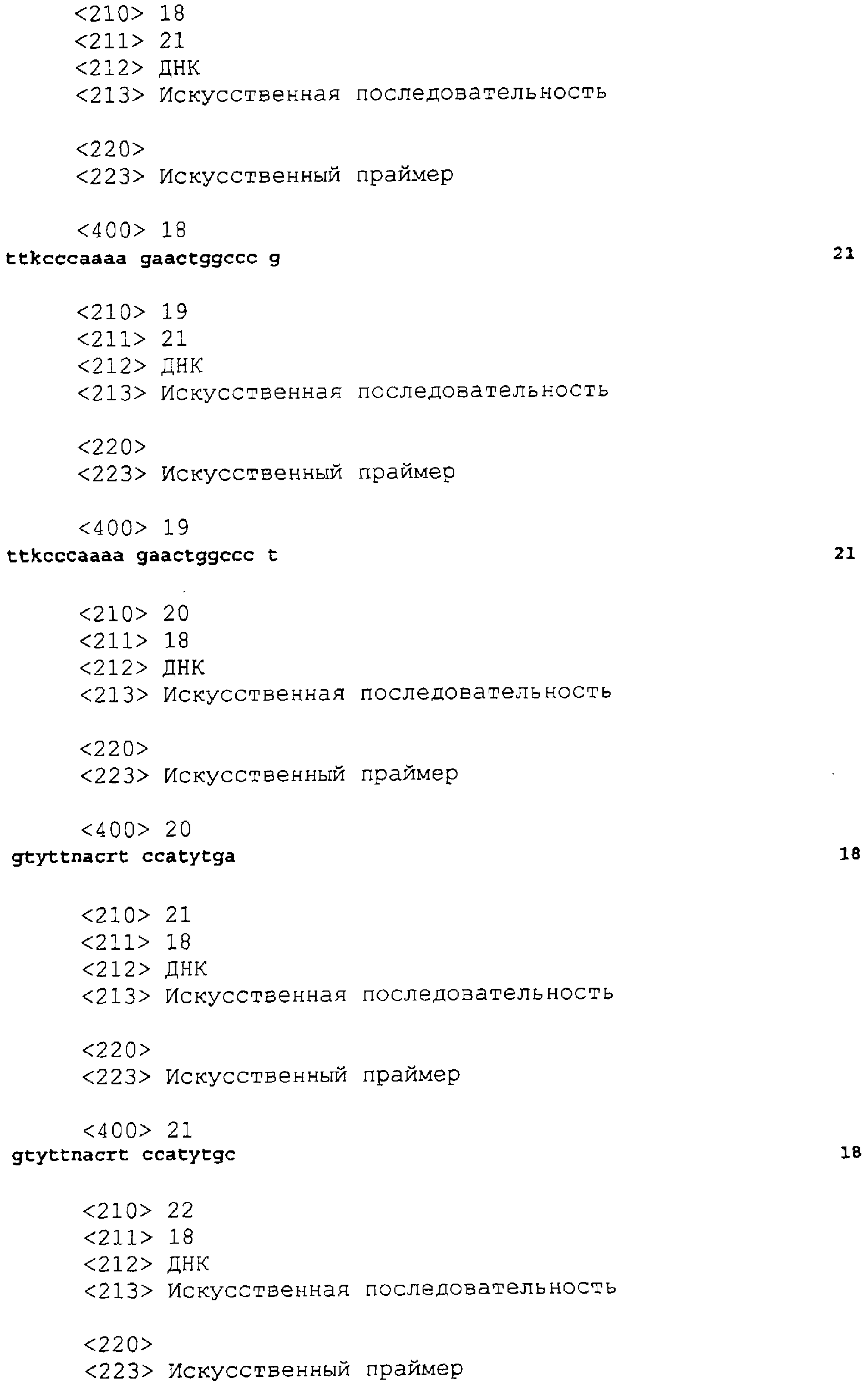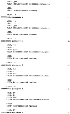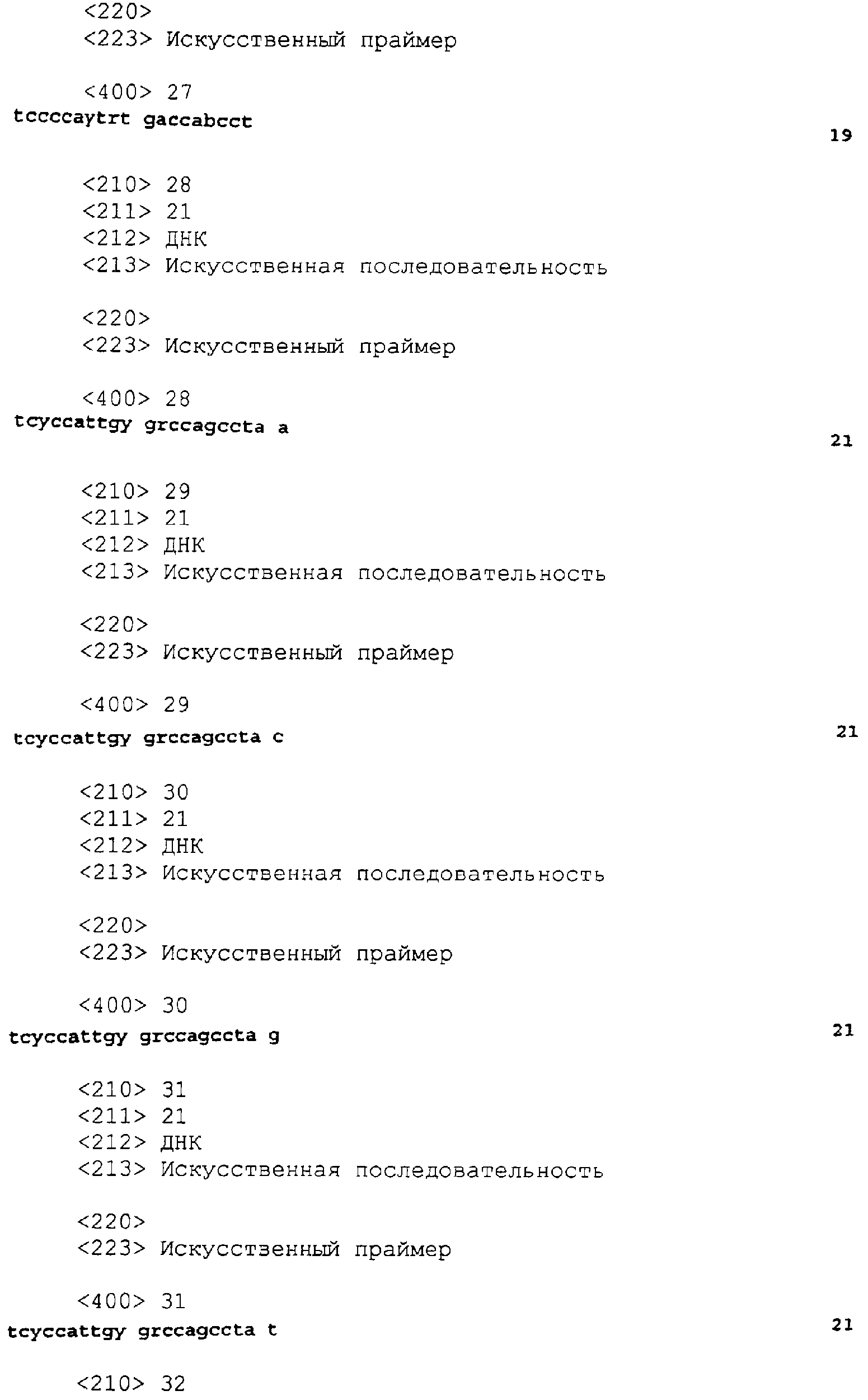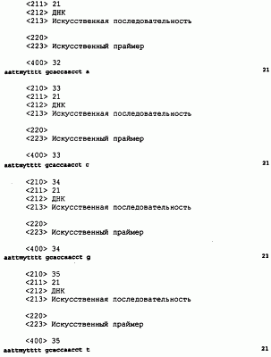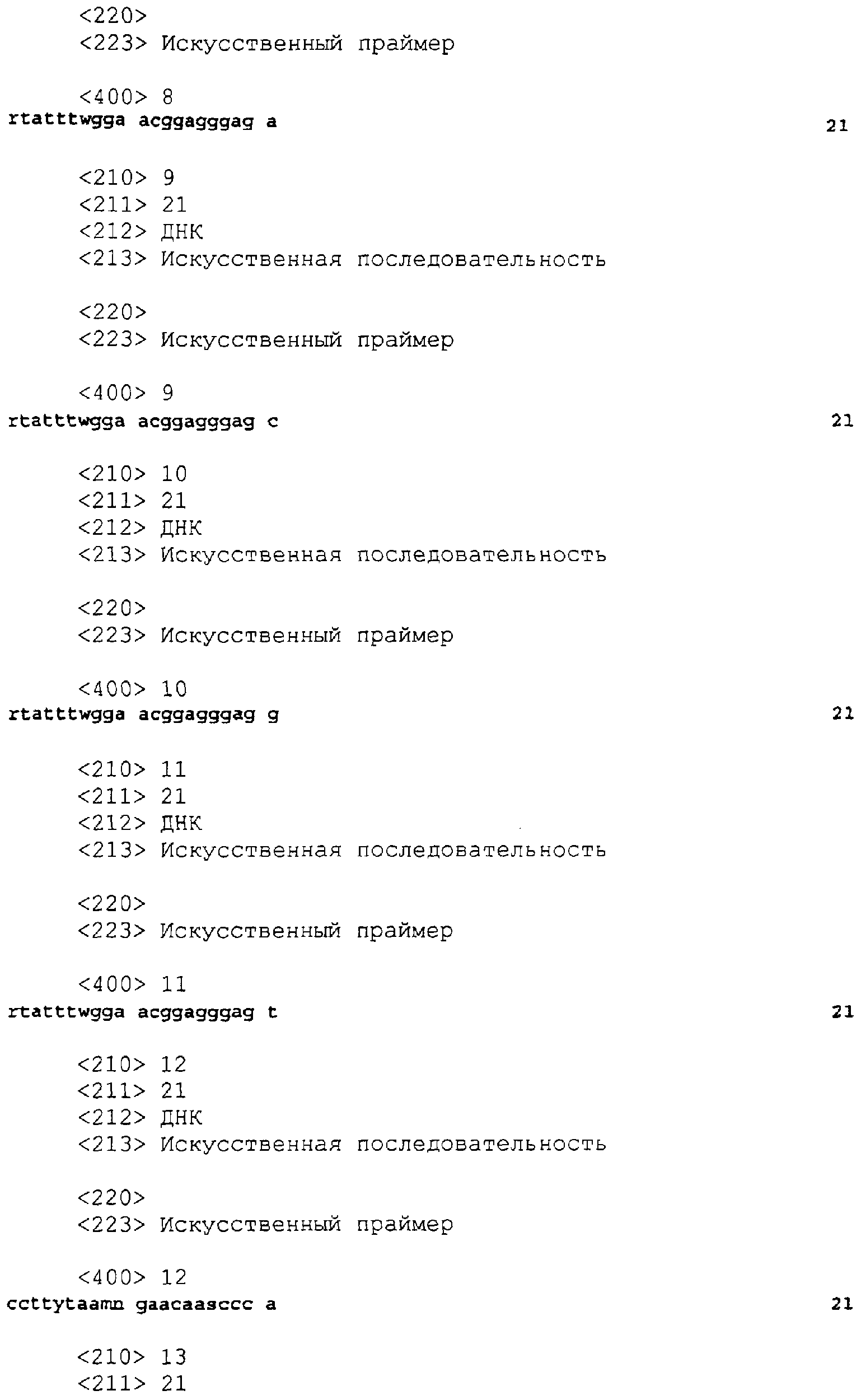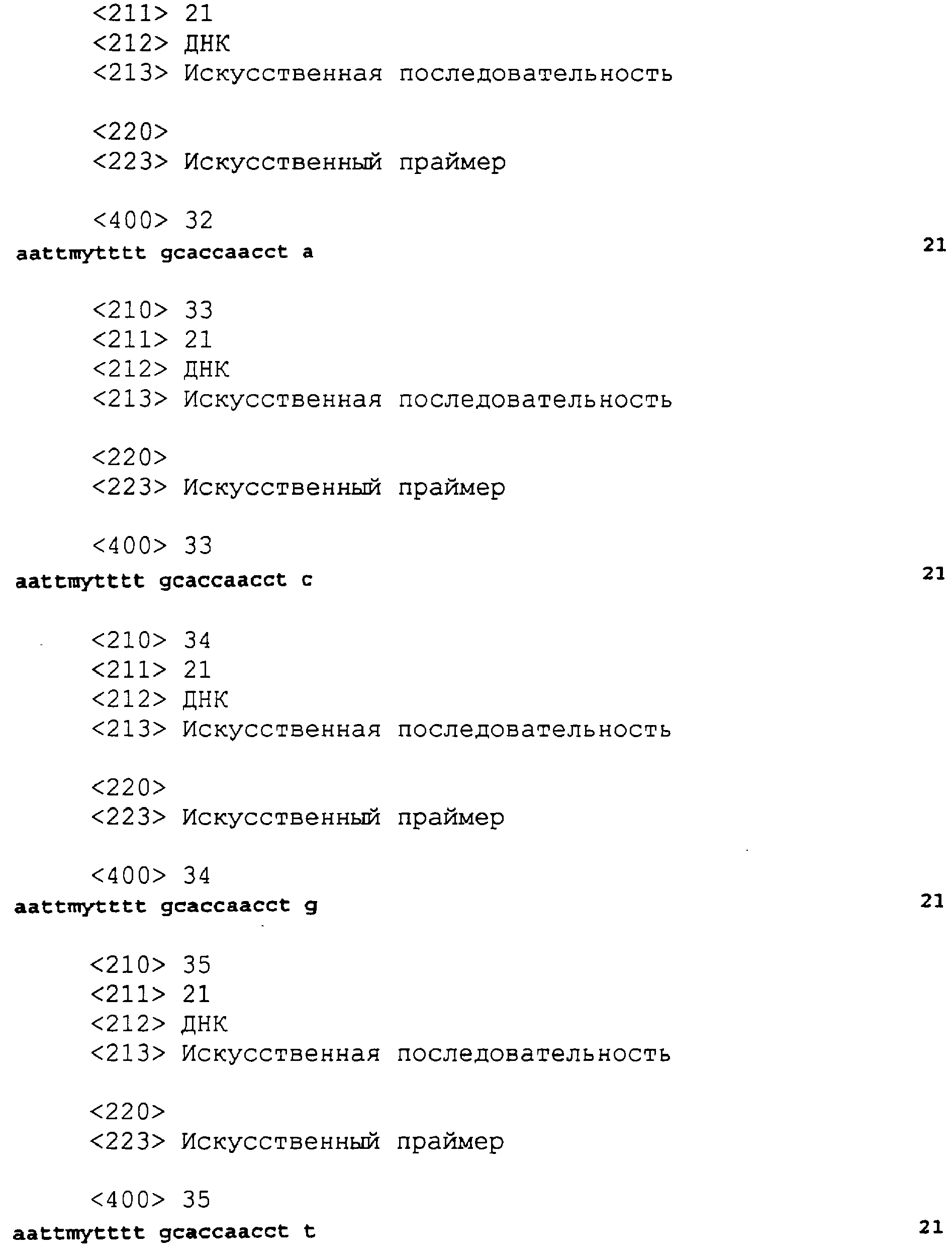 Наиболее предпочтительно, чтобы первый праймер имел последовательности нуклеиновой кислоты, выбранные из группы, состоящей из SEQ ID NO: I, SEQ ID NO: 2, SEQ ID NO: 3, SEQ ID NO: 4, SEQ ID NO: 5, SEQ ID NO: 6, SEQ ID NO: 7, SEQ ID NO: 8, SEQ ID NO: 9, SEQ ID NO: 10, SEQ ID NO: 11, SEQ ID NO: 12, SEQ ID NO: 13, SEQ ID NO: 14, SEQ ID NO: 15, SEQ ID NO: 16, SEQ ID NO: 17, SEQ ID NO: 18, SEQ ID NO: 19, SEQ ID NO: 20, SEQ ID NO: 21, SEQ ID NO: 22, SEQ ID NO: 23, SEQ ID NO: 24, SEQ ID NO: 25, SEQ ID NO: 26, SEQ ID NO: 27, SEQ ID NO: 28, SEQ ID NO: 29, SEQ ID NO: 30, SEQ ID NO: 31, SEQ ID NO: 32, SEQ ID NO: 33, SEQ ID NO: 34 и SEQ ID NO: 35.