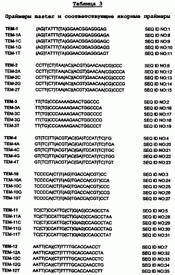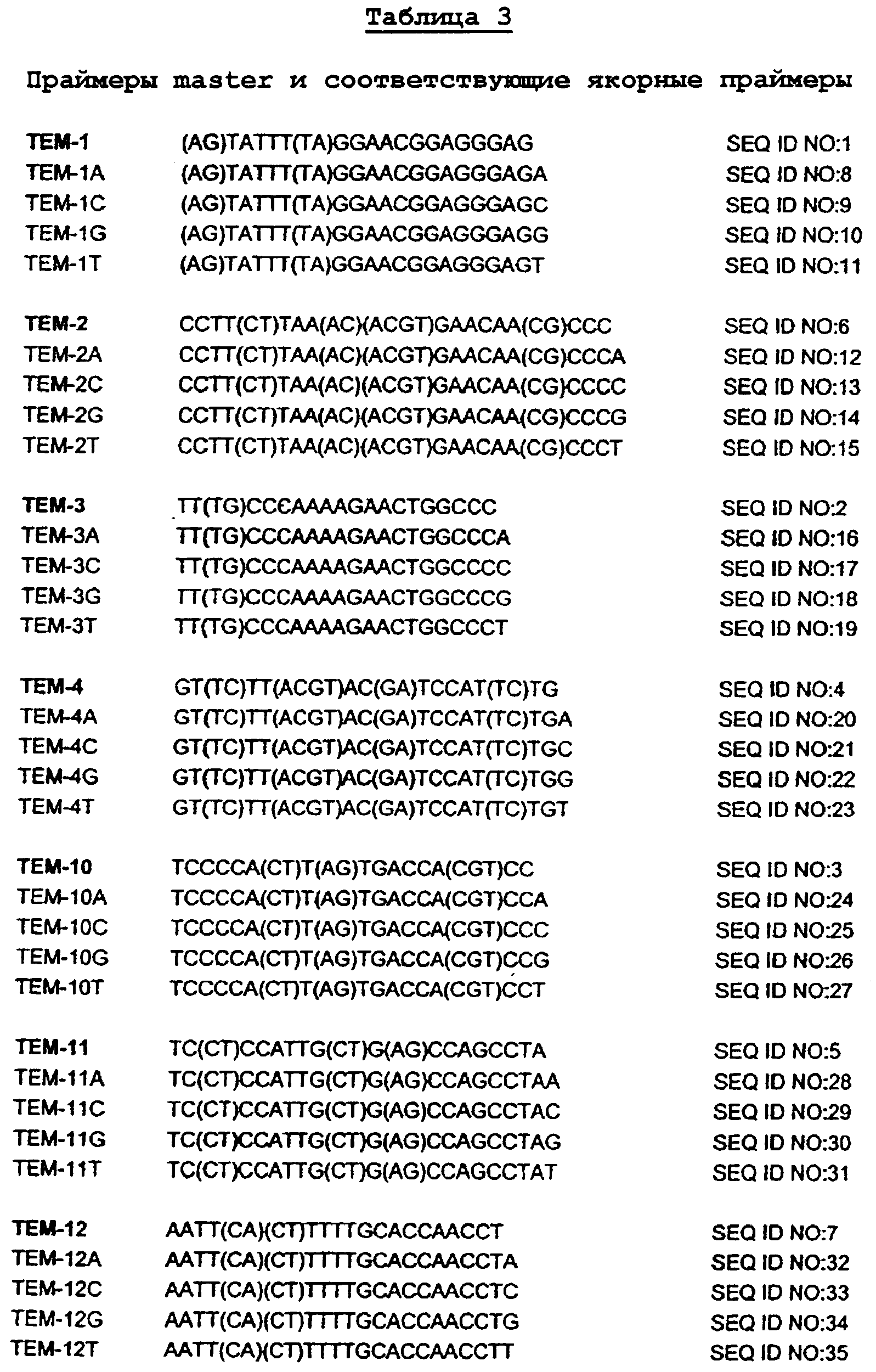 Амплификацию ПЦР для системы детекции в агарозе проводили в объеме 25 мкл, содержащем 2,5 мМ MgCl2, 0,4 мМ dNTP, 1 мкМ каждого из праймеров и 0,625 единицы ДНК-полимеразы AmpliTaq (Perkin-Elmer). Применяли следующий профиль: стадия исходной денатурации 1 мин 30 сек при 94°С; затем 35 циклов по 30 сек при 94°С, 45 сек при 58°С и 1 мин при 72°С и конечное удлинение 5 минут при 72°С. Данный профиль применяли, если специально не указано другое. Во всех случаях, когда включали ТЕМ-1, применяли температуру отжига 60°С.