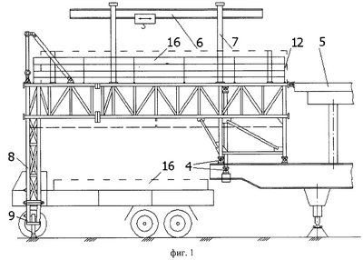 Механизированные стеллажи БУ левый 1 и правый 2 представляют собой Г-образную металлоконструкцию и содержат откидные площадки 20 (например, две) и дополнительные откидные площадки 3. Каждая из откидных площадок 3 и 20 имеет встроенный желоб. Дополнительные откидные площадки 3 (фиг.2) шарнирно прикреплены между стеллажами 1, 2 одной стороной к одному из них (например, правому 2), но можно крепить их и на оба стеллажа различно, т.е. часть – на левый 1 и часть – на правый 2. Левый 1 и правый 2 стеллажи крепятся при помощи пальцев и проушин 4 к ВЛБ 5 БУ (фиг.1). На стеллажах 1,2 установлена кран-балка 6, перемещающаяся по эстакаде 7. Консольные части стеллажей 1, 2 соединены с опорами 8, в нижней части которых шарнирно прикреплены площадки с домкратами 9 (например, винтовыми).