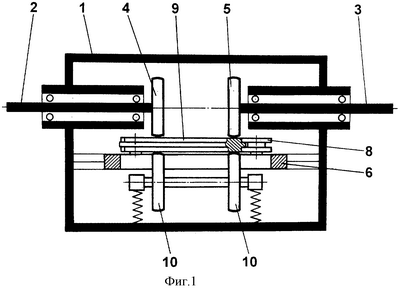 В корпусе 1 размещены входной 2 и выходной 3 валы, на концах которых закреплены фрикционные колеса 4 и 5. Входной вал 2 и выходной вал 3 соосны между собой. В корпусе 1 также размещена подвижная обойма 6. Подвижная обойма 6 имеет возможность прямолинейного перемещения вдоль оси входного вала 2 и выходного вала 3 с помощью винтового механизма 7. На подвижной обойме 6 с помощью опорных роликов 8 закреплен с возможностью свободного вращения фрикционный диск 9. Рабочее усилие на фрикционных колесах 4 и 5 создают подпружиненные ролики 10, закрепленные на подвижной обойме 6.