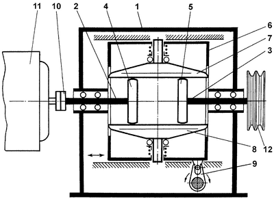 В корпусе 1 размещены входной 2 и выходной 3 валы, на концах которых закреплены фрикционные колеса 4 и 5. Входной вал 2 и выходной вал 3 соосны между собой. В корпусе 1 также размещена подвижная обойма 6, на которой закреплены подпружиненные фрикционные диски 7 и 8. Подвижная обойма 6 имеет возможность прямолинейного перемещения вдоль оси входного вала 2 и выходного вала 3 с помощью рычага 9. Входной вал 2 соединен через муфту 10 с электродвигателем 11. На выходном валу 3 закреплен шкив ременной передачи 12.