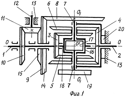 Под действием максимального по величине момента силы, приложенного к ведомому центральному колесу 4, оно начинает вращаться в противоположном направлении по сравнению с ведущим валом 1. Это приводит к замедлению вращения дополнительного сателлита 8, маховика 17 и уравновешивающего груза 19 вокруг линии оси О-О передачи и продольной линии О1-О1 радиальных валов 7, а следовательно, и относительно центральной точки О с соответствующим уменьшением тормозящего момента силы на водило. При этом величина передаваемого вращающего момента уменьшается в обратной зависимости от частоты вращения ведомого вала 2.