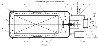 Внутри камеры расположены: калориферы 2, вентилятор 3, экраны 4, выполненные из эластичного материала, которые формируют аэродинамический тракт циркуляции агента сушки. Штабель пиломатериалов 12 обычно содержит ряд лежащих досок в продольном направлении.