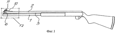На фиг.1 схематически показано огнестрельное оружие, в частности карабин, с двумя вертикально расположенными стволами 1 и 2, связанными между собой центральной планкой 3 и спаянные в бандаже, который не показан.