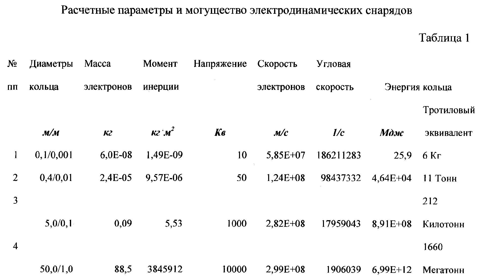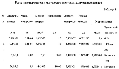Электроны достаточно просто разогнать до субсветовых скоростей. Электронные кольца высокой плотности, вращающиеся с такими скоростями, будут обладать колоссальной кинетической энергией при очень малой массе. В таблице 1 приведены результаты расчетов энергоемкости и массы электродинамических снарядов в виде электронных колец различных размеров, при условии, что плотность электронов в кольце примерно равна объемной плотности электронов в металлах, а масса электронов рассчитана с учетом релятивистского эффекта увеличения массы с ростом скорости.