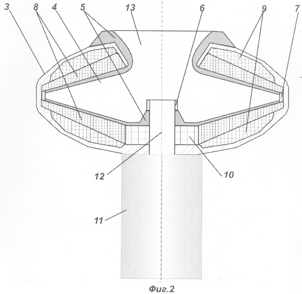 Конструкция катушек (соленоидов, электромагнитов) пушки показана на фиг.3-5. Отклоняющие катушки 8 (фиг.3) предназначены для создания магнитного поля, закручивающего электроны в кольцо, вращающееся внутри камеры 4 и сжатия кольца в момент выталкивания. Отклоняющие соленоиды (катушки, электромагниты) имеют цилиндрическую или коническую или иную форму с отверстием в центре, установлены на торцевых сторонах камеры сверху и снизу и подключены к источнику питания так, чтобы полюс магнитного поля верхнего соленоида (катушки, электромагнита), обращенный к кольцу заряженных частиц, был противоположен верхнему полюсу нижнего соленоида (катушки, электромагнита), также обращенного к кольцу заряженных частиц.
