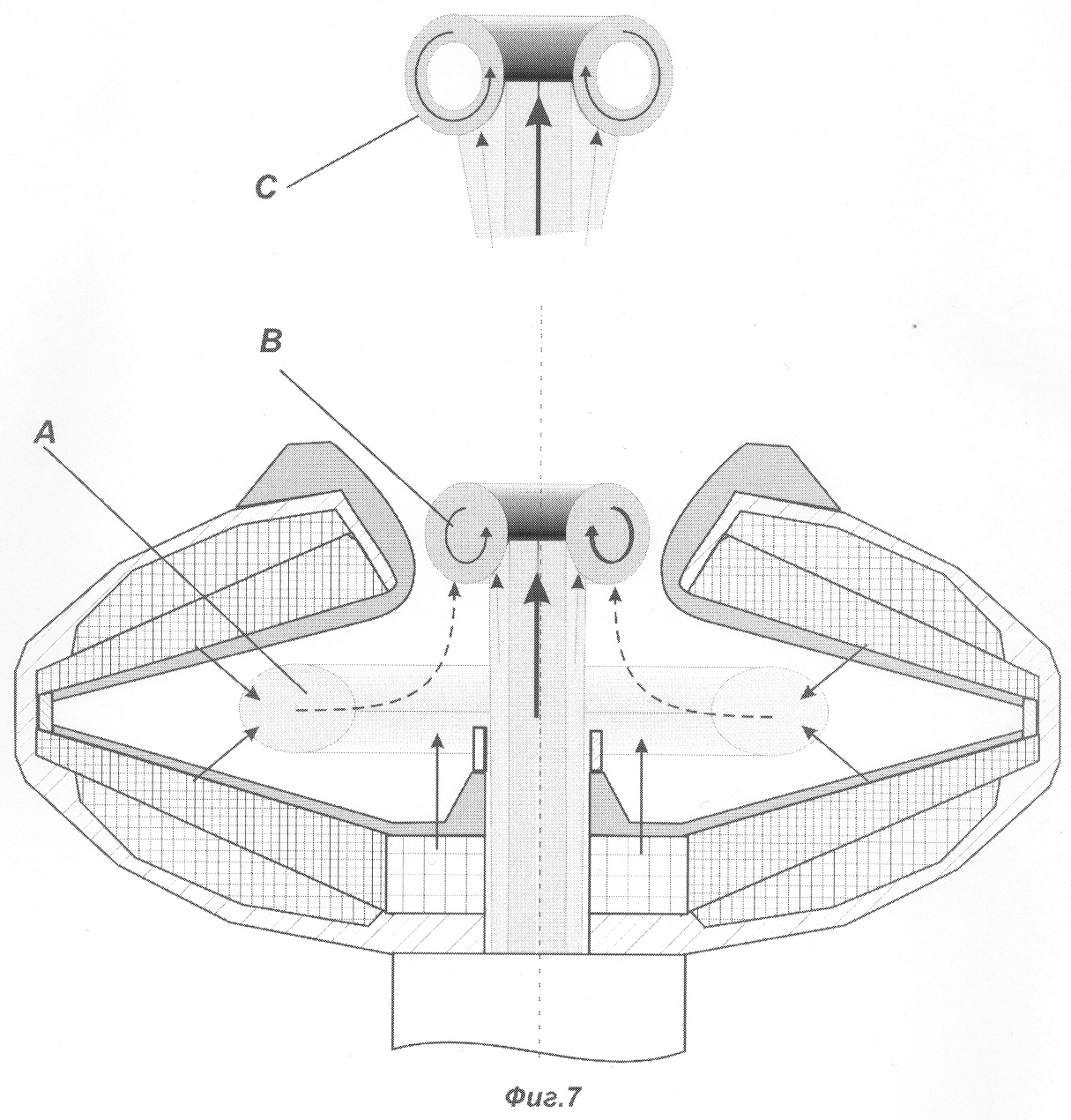 На фиг.7 показан процесс формирования тороидального электронно-динамического снаряда в пушке, где буквами показаны разные стадии выстрела: A) – формирование и накачка кольца электронов, В) – формирование и выталкивание тороидального электродинамического снаряда, С) – процесс разгона электродинамического снаряда кольцевым лазерным лучом.