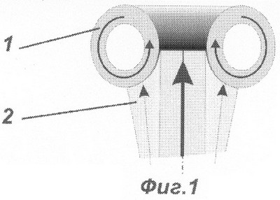 Электронно-динамический снаряд показан на фиг.1 и представляет собой тороидальное вихревое кольцо 1, образованное движущимися электронами. Снаряд разгоняется лазерным лучом 2, причем лазерный луч 2 при разгоне преимущественно действует только на те области донной части снаряда, где направление движение электронов в тороиде (показано круговыми стрелками) совпадает или близко к направлению движения луча лазера 2. На фиг.1 эта область расположена между внутренним и средним радиусом кольца тороидального снаряда. При управлении траекторией снаряда 1 луч 2 может действовать на любую часть снаряда с учетом гироскопического эффекта.