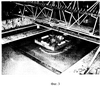 2. Устройство для испытаний модели морского инженерного сооружения в ледовом опытовом бассейне, содержащее канал, заполненный водой, на поверхности которой образовано ледовое поле, съемную металлическую ферму, неподвижно соединенную с днищем канала, буксировочную тележку с электроприводом и ходовыми колесами, находящимися в контакте с рельсами, проложенными вдоль канала, и оборудованную бульдозером для перемещения ледового поля, датчик скорости движения буксировочной тележки, динамометрическую и регистрирующую аппаратуру, отличающееся тем, что модель снабжена якорными связями, с помощью которых она закреплена на ферме, при этом якорные связи оснащены динамометрами силы натяжения и устройствами регулировки связи на заданное начальное натяжение и выполнены неоднородными по длине, ферма содержит плоское горизонтальное основание, вертикальные стойки и блоки, причем основание фермы снабжено устройствами крепления вертикальных стоек с возможностью их установки в заданных точках основания, а вертикальные стойки снабжены блоками и устройствами их крепления с возможностью смещения их по высоте вдоль стоек и фиксации в заданном положении, а модель оборудована датчиками ее угловых и линейных перемещений в направлении осей X, Y, Z, выходы динамометров силы натяжения якорных связей, датчиков угловых и линейных перемещений модели соединены со входом ЭВМ.