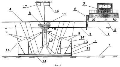 Устройство для испытаний модели морского инженерного сооружения в ледовом опытовом бассейне содержит (фиг.1) канал 1, заполненный водой, на поверхности которой образовано ледовое поле 2, буксировочную тележку 3 с электроприводом и ходовыми колесами, находящимися в контакте с рельсами 4, проложенными вдоль канала, датчик скорости движения буксировочной тележки 5, бульдозер 6, съемную металлическую ферму 7, неподвижно соединенную с днищем канала, модель инженерного сооружения 8, которая снабжена якорными связями 9, с помощью которых она закреплена на ферме, динамометры силы натяжения в связях 10, устройство регулировки связи на заданное начальное натяжение 11 (фиг.2). Ферма 7 содержит плоское основание 12, вертикальные стойки 13, блоки 14. Основание фермы 12 снабжено устройствами крепления вертикальных стоек 13 с возможностью их установки в заданных точках основания (не показано). Вертикальные стойки 13 снабжены блоками и устройствами их крепления 14 с возможностью смешения их по высоте вдоль стоек и фиксации в заданном положении. Модель 8 оборудована гиросконическими датчиками ее угловых перемещений (крена, дифферента, рыскания) 15 и соединена гибкими связями с прецизионными потенциометрическими датчиками 16, 17 линейных перемещений модели в направлении осей X, Y, Z. Выходы динамометров силы натяжения якорных связей 10, датчиков угловых перемещений 15 и датчиков линейных перемещений модели 16, 17 соединены со входом ЭВМ (ЭВМ и линии связи с ней динамометров и датчиков не показаны).