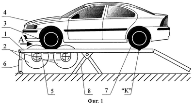 Транспортное средство “испытывает” само себя, так как предлагаемый стенд не требует для своей работы какого-либо приводного двигателя и тормозных устройств, за исключением насосной установки для привода гидроцилиндра.