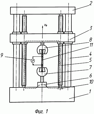 Датчик силы может устанавливаться также на траверсы 2 и 3. Кроме того, возможно испытание на сжатие и изгиб, тогда захваты 8 и 9 заменяются опорами-тарелями или специальными опорами (на чертеже не показаны), а движение траверсы 3 направлено в направлении, противоположном Vo.