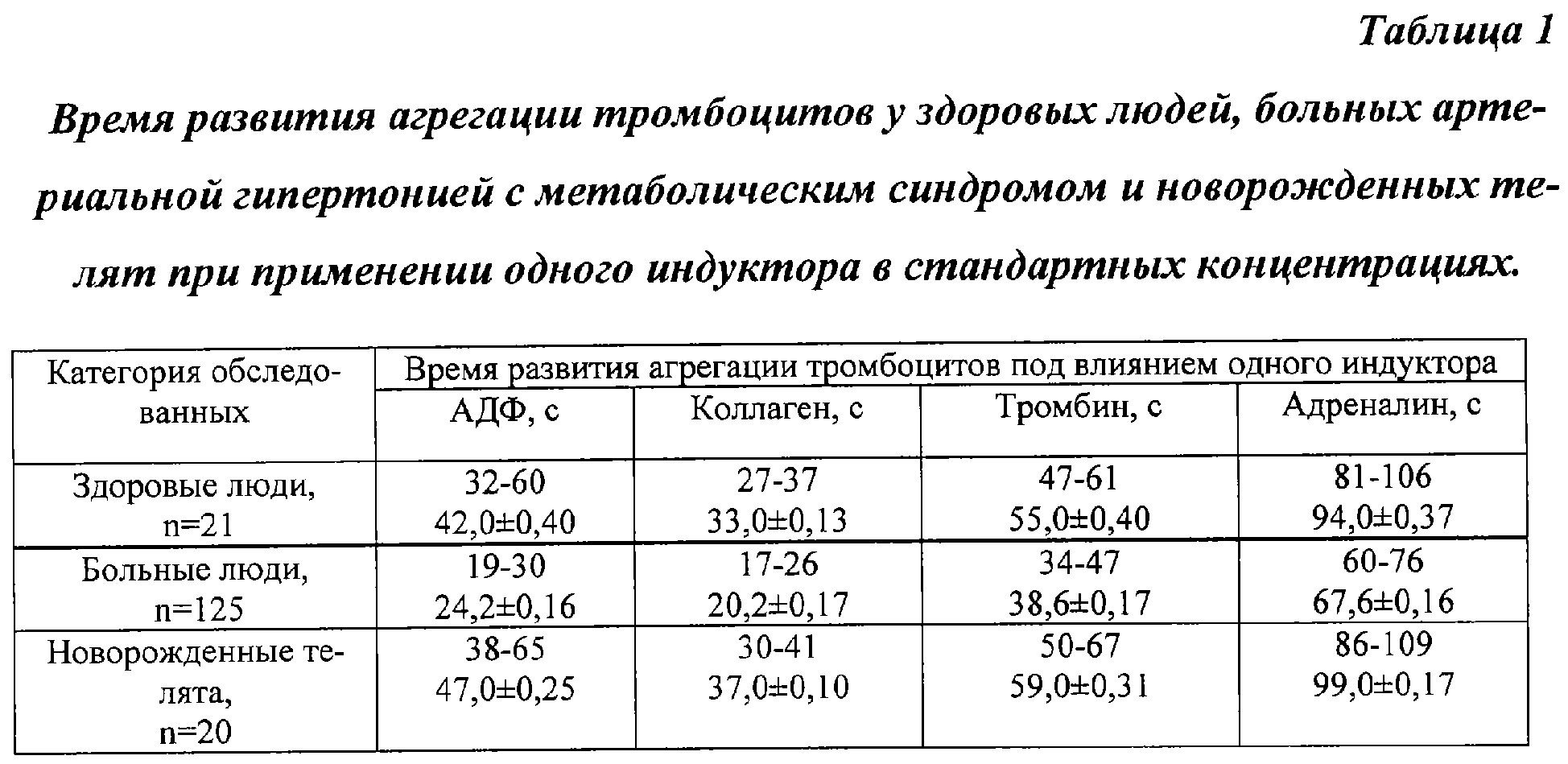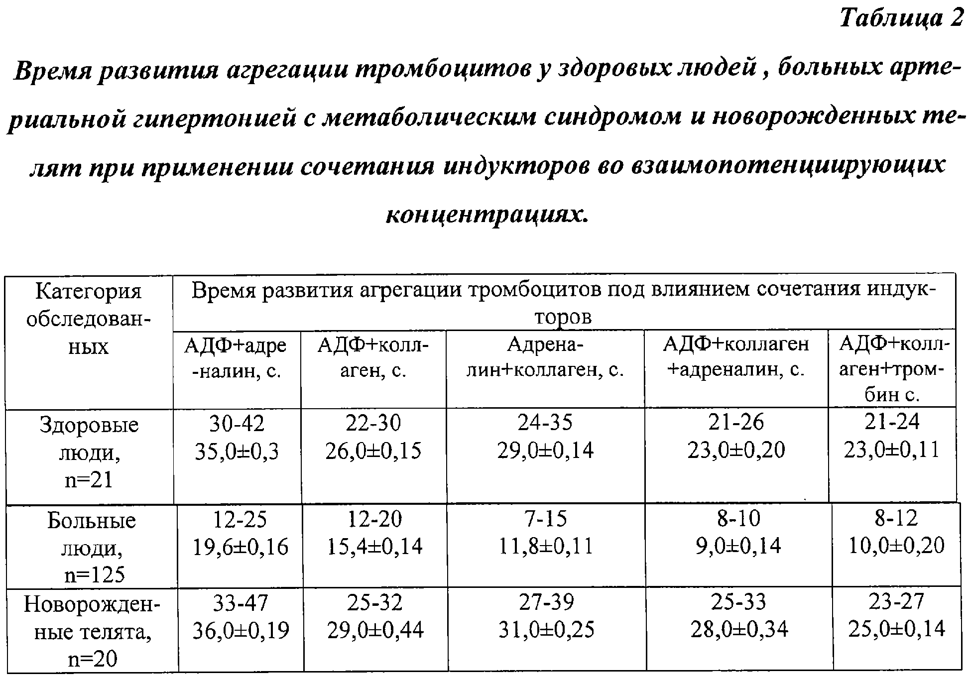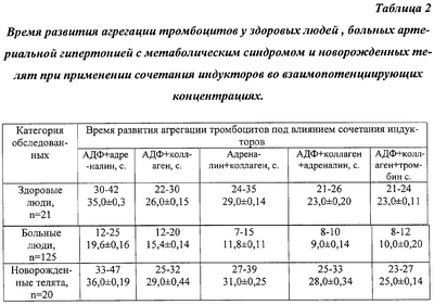 1. Способ диагностики начинающихся нарушений агрегации тромбоцитов, включающий взятие крови, ее стабилизацию, выделение богатой тромбоцитами плазмы и нанесение ее на предметное стекло, добавление индуктора агрегации, отличающийся тем, что у обследуемых оценивают время возникновения агрегации тромбоцитов одновременно с несколькими индукторами, выбранными из АДФ, адреналина, коллагена, тромбина, используя минимальные взаимопотенциирующие концентрации индукторов агрегации, которые составляют при двойном сочетании индукторов у людей: АДФ – 10-6 М, адреналин – 2,5·10-7 М, коллаген – разведение основной суспензии 1:4, тромбин – 0,100 ед/мл.; у новорожденных телят АДФ 5,0·10-6 М, адреналин 5,0·10-7 М, коллаген – разведение основной суспензии 1:3, тромбин 0,110 ед/мл; при тройном сочетании индукторов у людей: АДФ – 5,0·10-7 М, адреналин – 10-7 М, коллаген – разведение основной суспензии 1:5, тромбин – 0,090 ед/мл, у новорожденных телят: АДФ 7,5·10-7 М, адреналин 2,0·10-7 М, коллаген – разведение основной суспензии 1:4, тромбин 0,100 ед/мл, выявляют отклонения времени агрегации тромбоцитов от границ нормы, которые составляют для здоровых людей при использовании сочетания индукторов АДФ + адреналин 30-42 с, АДФ + коллаген 22-30 с, адреналин + коллаген 24-35 с, АДФ + коллаген + адреналин 21-26 с, АДФ + коллаген + тромбин 21-24 с, для новорожденных телят АДФ + адреналин 33- 47 с, АДФ + коллаген 25-32 с, адреналин + коллаген 27-39 с, АДФ + коллаген + адреналин 25-33 с, АДФ + коллаген + тромбин 23-27 с.