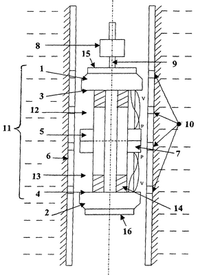 1. Способ акустического воздействия на нефтяной пласт, заключающийся в том, что в зону перфорации обсадной колонны помещают акустический излучатель, содержащий два излучающих элемента в форме диска с плоскими излучающими поверхностями, перекрывающими внутреннее сечение обсадной колонны, по меньшей мере, один отражающий экран, расположенный между ними на внешней поверхности корпуса излучателя, а создаваемое акустическое поле локализуют в двух резонирующих объемах, ограниченных излучающими элементами, стенками обсадной колонны, внешней поверхностью корпуса излучателя и отражающими поверхностями экрана, причем в каждом резонирующем объеме излучающую поверхность излучающего элемента и отражающую поверхность экрана располагают перпендикулярно оси обсадной колонны на расстоянии между этими поверхностями, равном половине длины волны в скважинной жидкости на резонансной частоте акустического излучателя, при этом внешние поверхности излучающих элементов защищают акустически мягкими экранами.