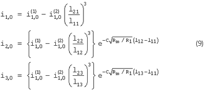 Если передатчики располагаются достаточно далеко друг от друга, измеренный ток i1 имеет только моду нулевого порядка i1,0. Токи i1 (1) и i1 (2) соответствуют передатчикам, возбуждаемым не масштабированным током.