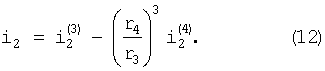 Далее переменный ток, имеющий известные параметры, проходит через передатчик Т3, в то время как переменный ток, масштабированный коэффициентом (r3/r4)3, одновременно проходит через передатчик Т4. Ток, индуцированный вдоль ствола скважины, измеряется датчиком i1. Ток, связанный с Т3 и Т4, выражается как