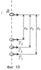 Другой вариант воплощения изобретения представляет собой процесс, выполненный с конфигурацией инструмента фиг.9. В данном процессе определяют расстояния между выбранными антеннами T1, Т2, Т3, Т4 и, исходя из этих промежутков, вычисляют несколько масштабирующих коэффициентов. Переменный ток, имеющий известные параметры, проходит через T1, в то время как переменный ток, масштабированный коэффициентом (r2/r1)3, одновременно проходит через передатчик Т2. Ток, индуцированный вдоль ствола скважины, детектируется и измеряется датчиком i1. Ток, связанный с T1 и Т2, выражается как
