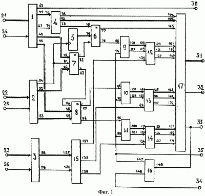 На фиг.1 показаны первый 21, второй 22, третий 23 информационные входы системы, первый 24, второй 25 и третий 26 синхронизирующие входы системы, а также информационный 30 и адресный 31 выходы системы, первый 32, второй 33 и третий 34 синхронизирующие выходы системы.