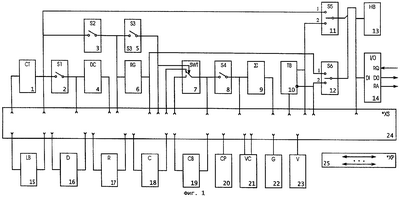 Наборы резисторов 17 и конденсаторов 18 используются для формирования интегрирующих и дифференцирующих цепочек, линий задержки, а также для построения резисторных делителей напряжения. Набор диодов 16 используется для построения формирователей, объединителей, разветвителей.
