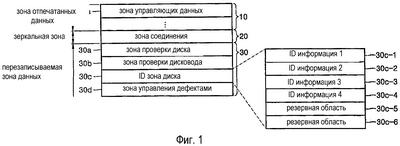 Перезаписываемая зона 30 данных может включать зону 30а проверки диска, зону 30b проверки дисковода, ID зону 30с диска и зону 30d управления дефектами. ID зона 30с диска включает по меньшей мере одну область с ID информацией о диске, в которой записана ID информация о диске. В настоящем варианте осуществления изобретения в ID зону 30с диска включены с первой по четвертую области 30с-1, 30с-2, 30с-3 и 30с-4 с ID информацией о диске. Дополнительно могут быть также включены резервные области 30с-5 и 30с-6, в которые может быть записана другая информация.