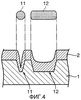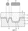 На фиг.4 представлено сечение оптического диска с металлической отражающей пленкой толщиной 100 нм, выполненной из сплава AgPdCu на подложке со сформированными питами. Как показано на фиг.4, самый короткий пит 11 и длинный пит 12, длина которого превышает длину самого короткого пита 11, сформированы на подложке 1. В этом случае на донном участке самого короткого пита 11 металлическую отражающую пленку 2 труднее сформировать, чем на донном участке длинного пита 12. Поэтому самый короткий пит 11 после формирования металлической отражающей пленки 2 становится меньше и в то же самое время глубже, чем он был на подложке 1.