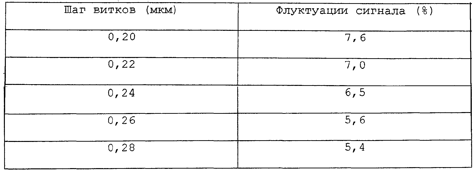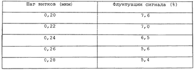 Поэтому были проведены многочисленные исследования по поиску наиболее применимых значений шага витков с использованием устройства для воспроизведения информации, в котором длина волны излучения источника света, использованного для воспроизведения, составила 405 нм, а числовая апертура NA объектива – 0,85. В результате таких исследований были получены приводимые ниже данные измерений. Данные представлены с учетом практической возможности пренебречь перекрестными помехами по сравнению с основным сигналом, если шаг витков составляет не менее 0,24 мкм.