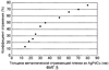 Далее был проведен анализ применимой толщины металлической отражающей пленки. Сначала была подготовлена подложка, в которой глубина пита составила /(4×n). В качестве металлической отражающей пленки были использованы два вида пленки – из сплава AgPdCu и сплава на основе Al с чистотой 99 мас.%. Затем были проведены измерения флуктуаций сигнала при изменении толщины пленки. На фиг.2 представлен полученный в результате измерений график зависимости флуктуаций сигнала от толщины металлической отражающей пленки, выполненной из сплава AgPdCu. А на фиг.3 – полученный в результате измерений график зависимости флуктуаций сигнала от толщины металлической отражающей пленки, выполненной из сплава на основе Al. На каждой из фигур по горизонтальной оси отложена толщина металлической отражающей пленки (нм), а по вертикальной оси – флуктуации сигнала (%).
